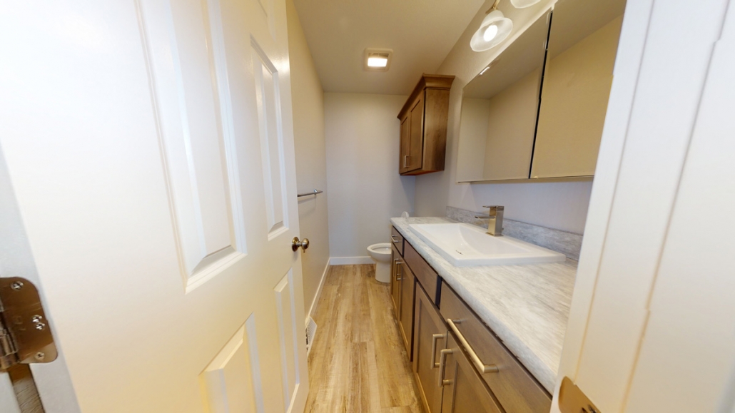 After drying out the bathroom with fans and dehumidifiers, we removed wet baseboards, wall boards, drywall, and more to handle structural issues behind the walls. When those were corrected, we installed replacement flooring and finish-outs.