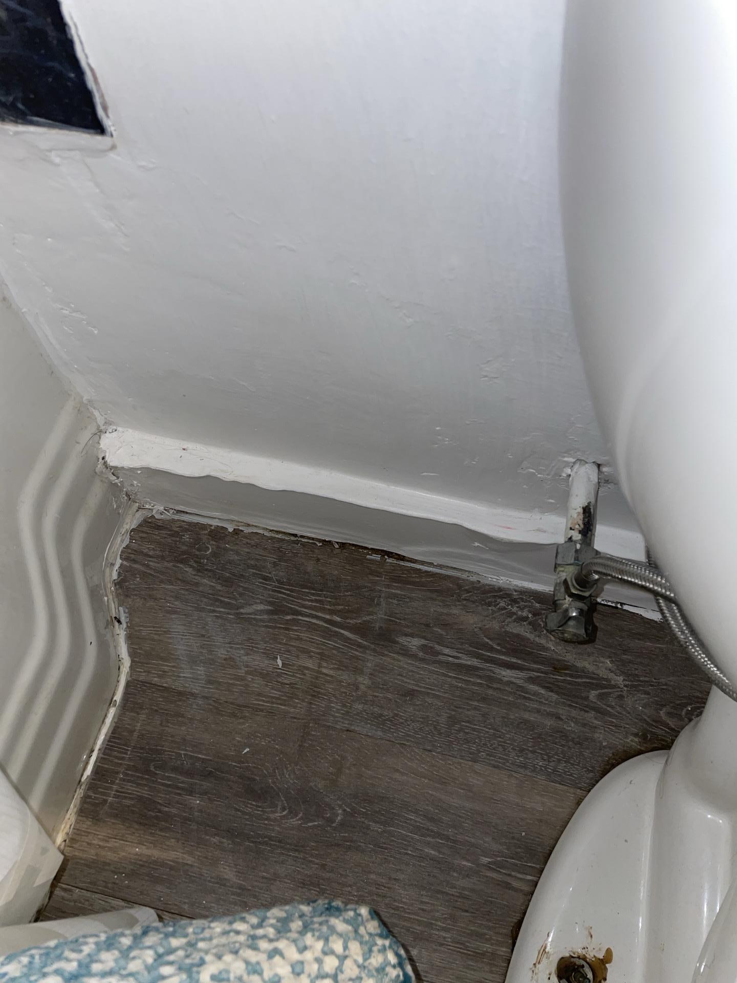 Close-up of bathroom baseboards and flooring during a sewage mitigation project, highlighting the areas requiring deep cleaning and sanitization