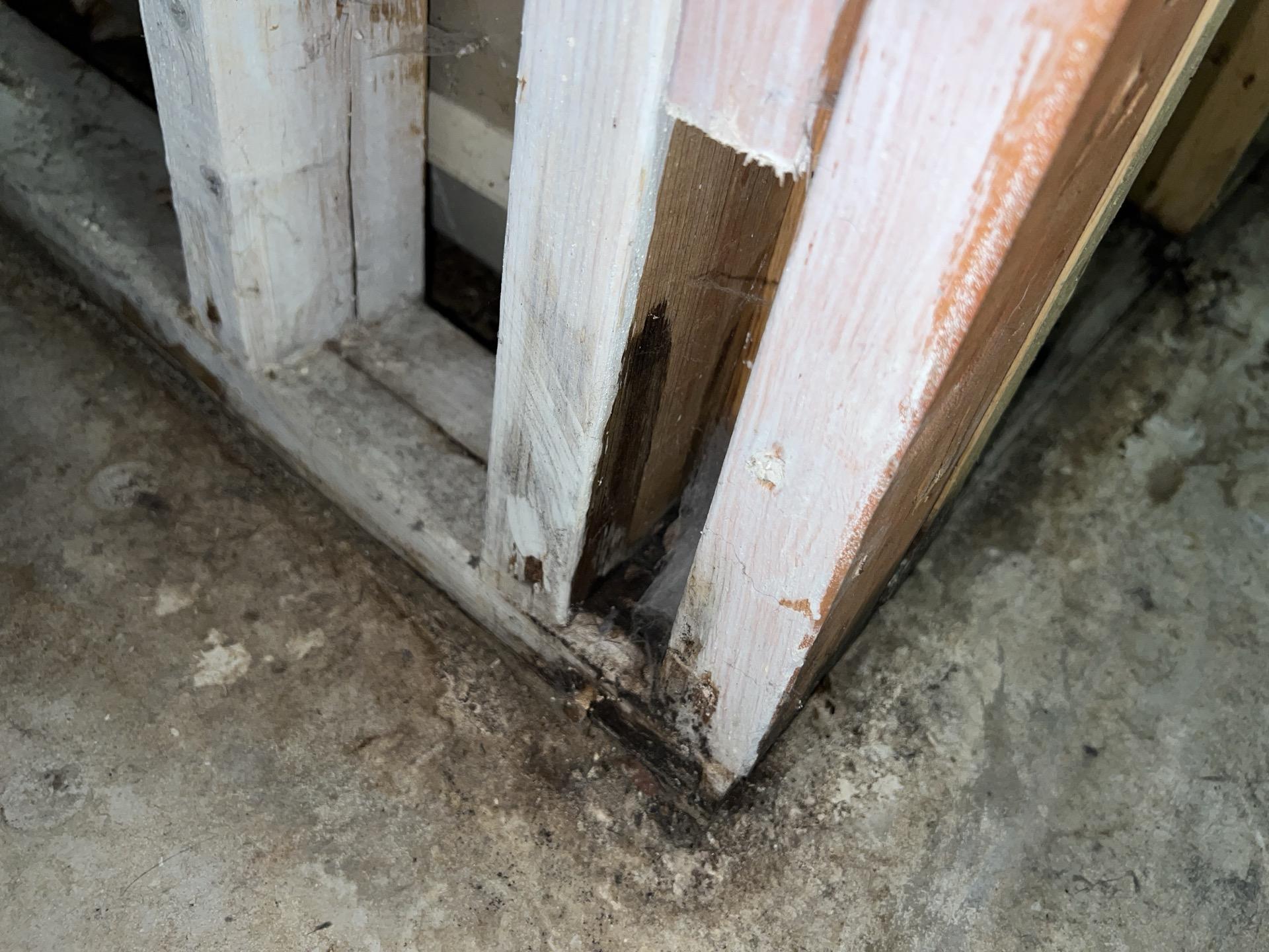 A close-up of structural framing showing microbial (mold) growth and water damage. Our deep cleaning service includes HEPA vacuuming, sanding, and sanitizing non-porous materials to complete a full mold remediation process.