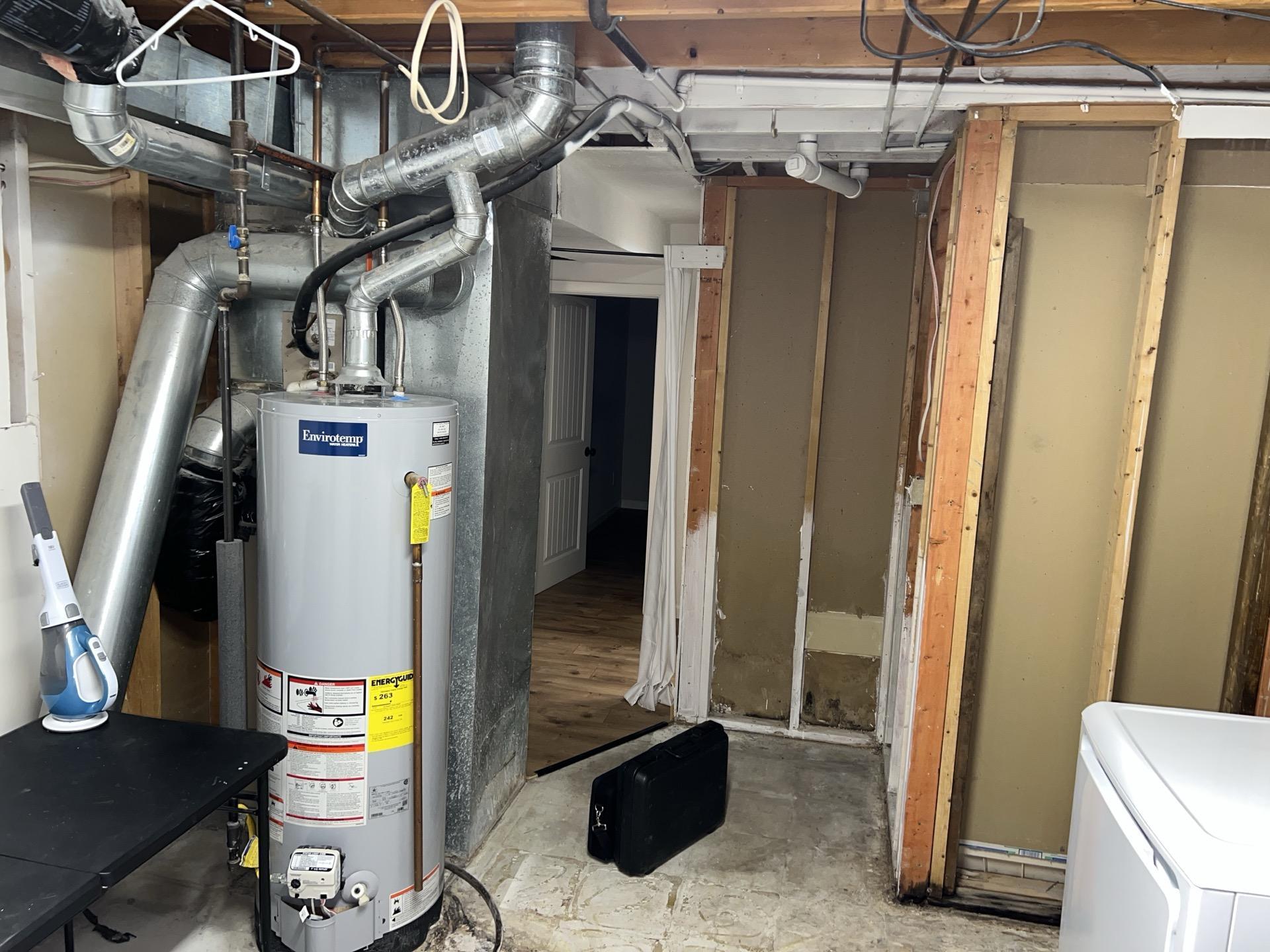 Professional mold remediation and water damage mitigation in a utility room. This image shows the removal of mold-affected drywall and framing around a water heater and HVAC system to ensure a safe, clean environment.
