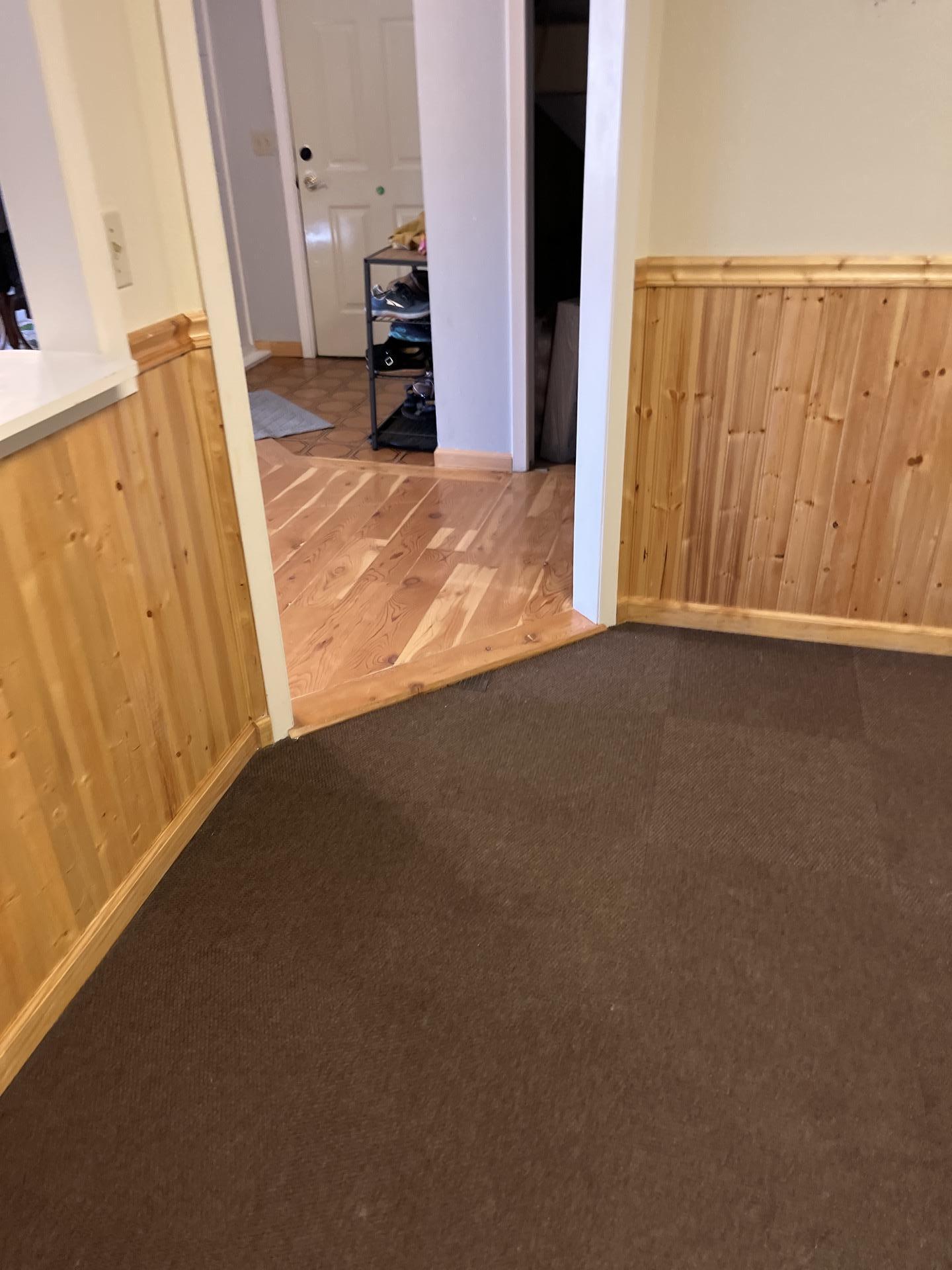 Initial site assessment for professional remediation services in a residential home, showing the transition between wood and carpeted flooring where a containment wall will be established for safe property restoration.
