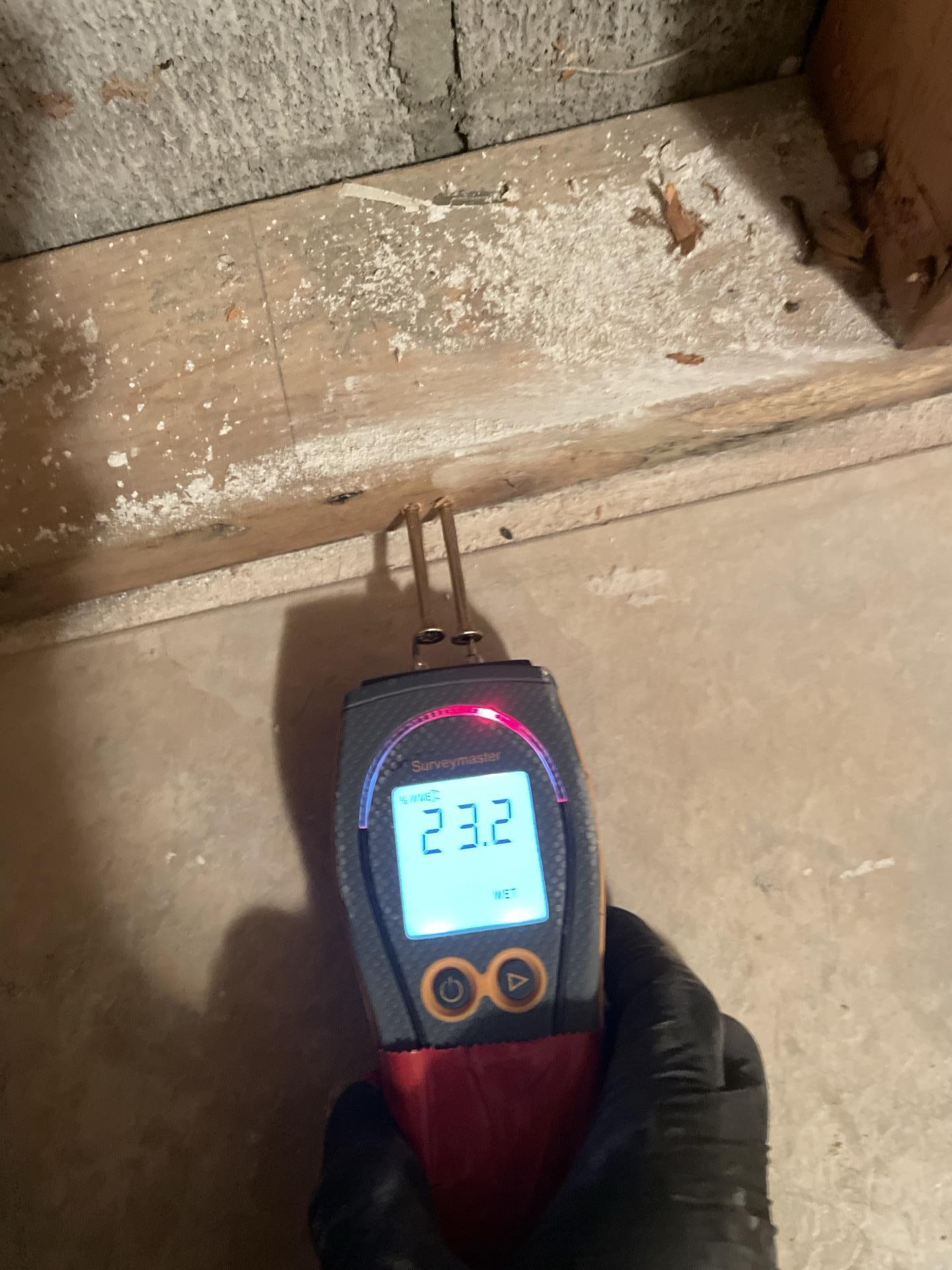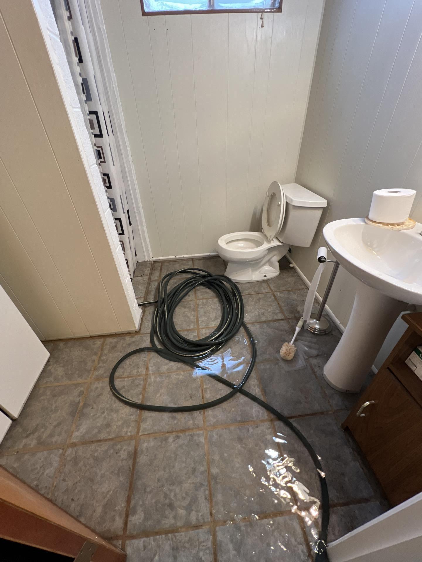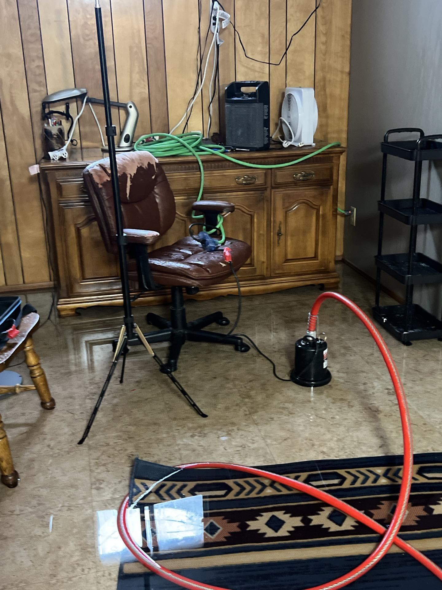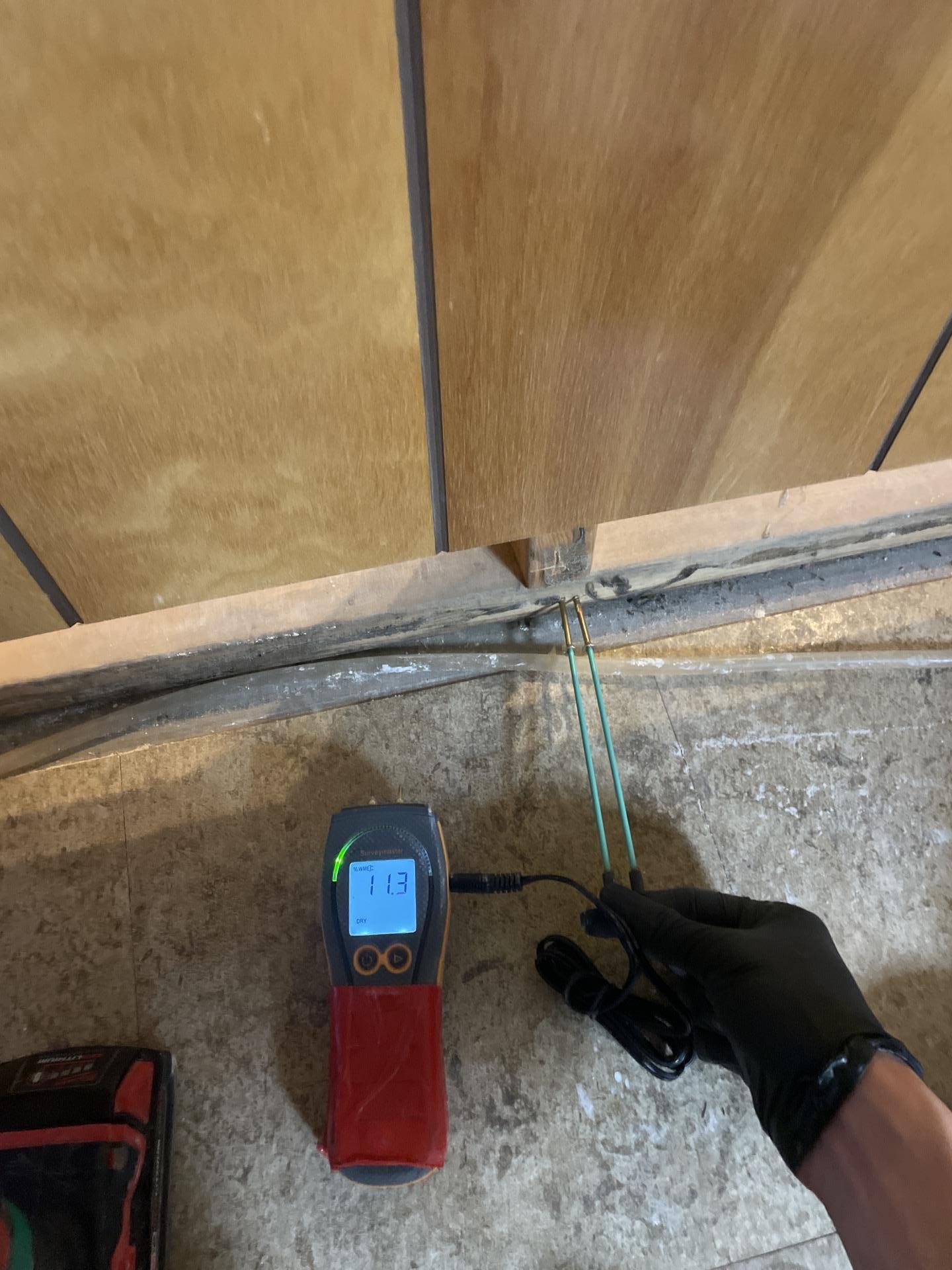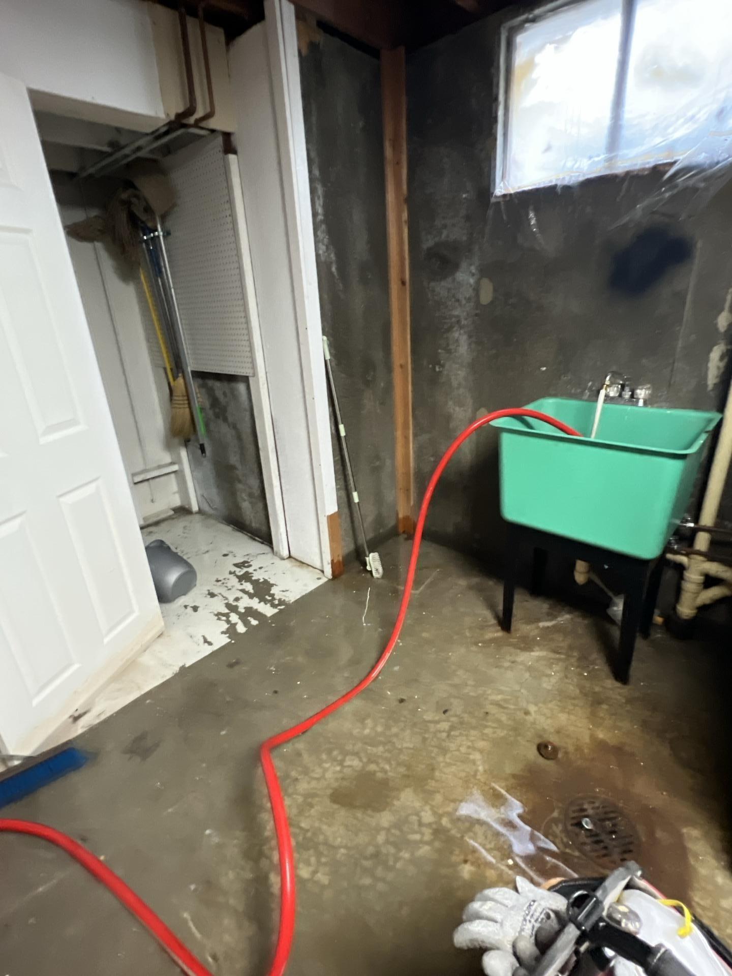 Our team promptly responded by extracting bulk water from the basement using two trash pumps, garden hoses, and a portable extractor over a five-hour period. Areas in the living room were contained, and a dehumidifier was placed in the main level kitchen, with drying and dehumidification equipment set up in the basement. Subsequent monitoring visits confirmed a significant drop in humidity and ongoing evaporation and drying. Three additional air movers and a jump box were deployed to enhance drying efforts. A walk-through was conducted with the homeowner, Eric, to discuss necessary demolition; however, no demolition was performed at that time due to the homeowner lacking insurance. Moisture checks were performed on 2ft cuts and baseboard cuts throughout the basement, which were found dry by meter and touch. Invasive points were drilled and elevated in all affected basement areas for continuous moisture monitoring, and air movement was readjusted. Two air movers and one Velo were removed as drying progressed. Air movement was intentionally not directed towards the bathroom area due to visible microbial growth on the sill plates. Documentation of all dry areas confirmed by meter was recorded.