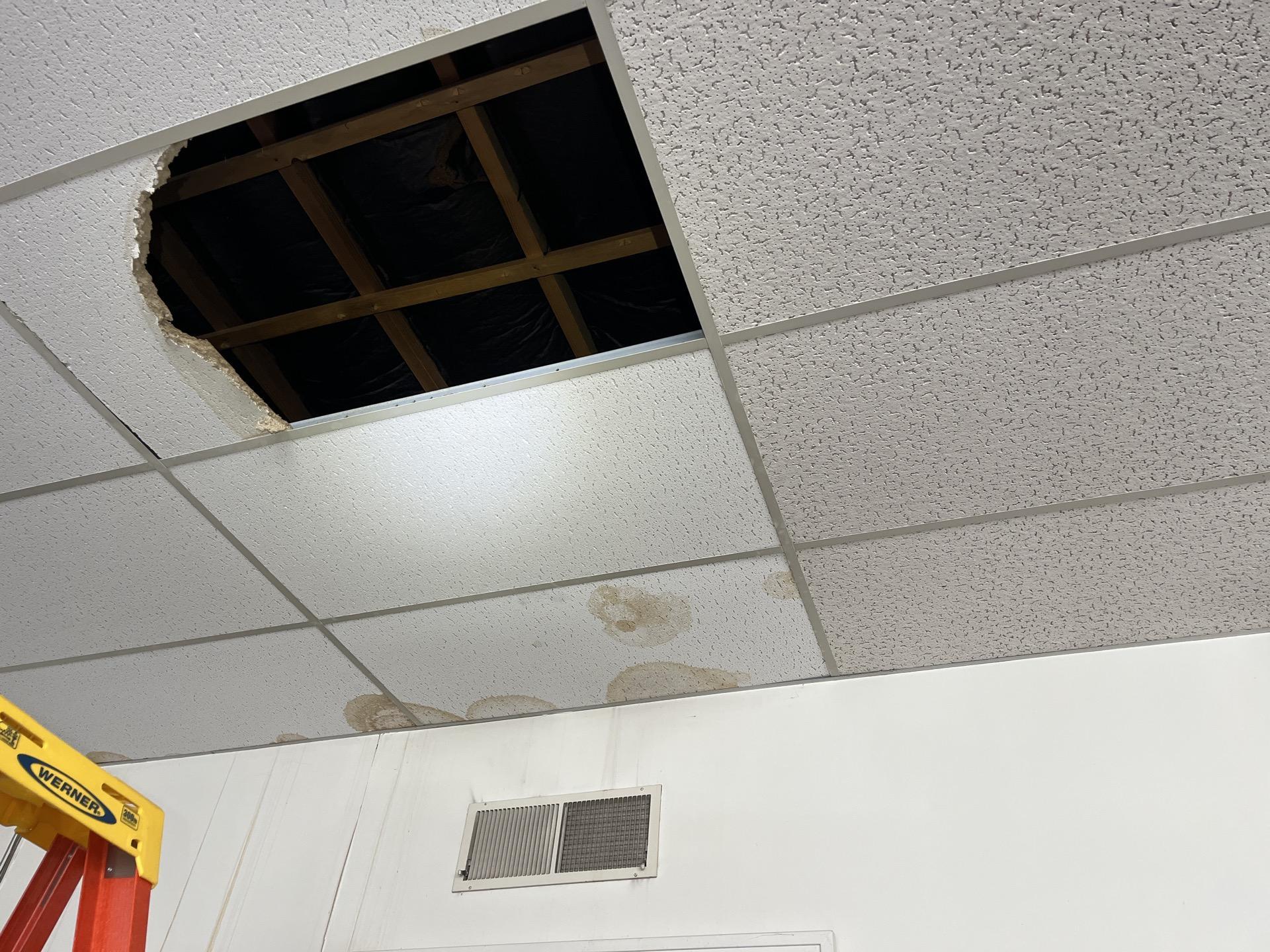 A commercial building experienced roof leaks in the lobby/office area, leading to water staining on ceiling tiles, drywall, and wood roof decking. Minimal microbial growth was observed on the roof decking and framing.