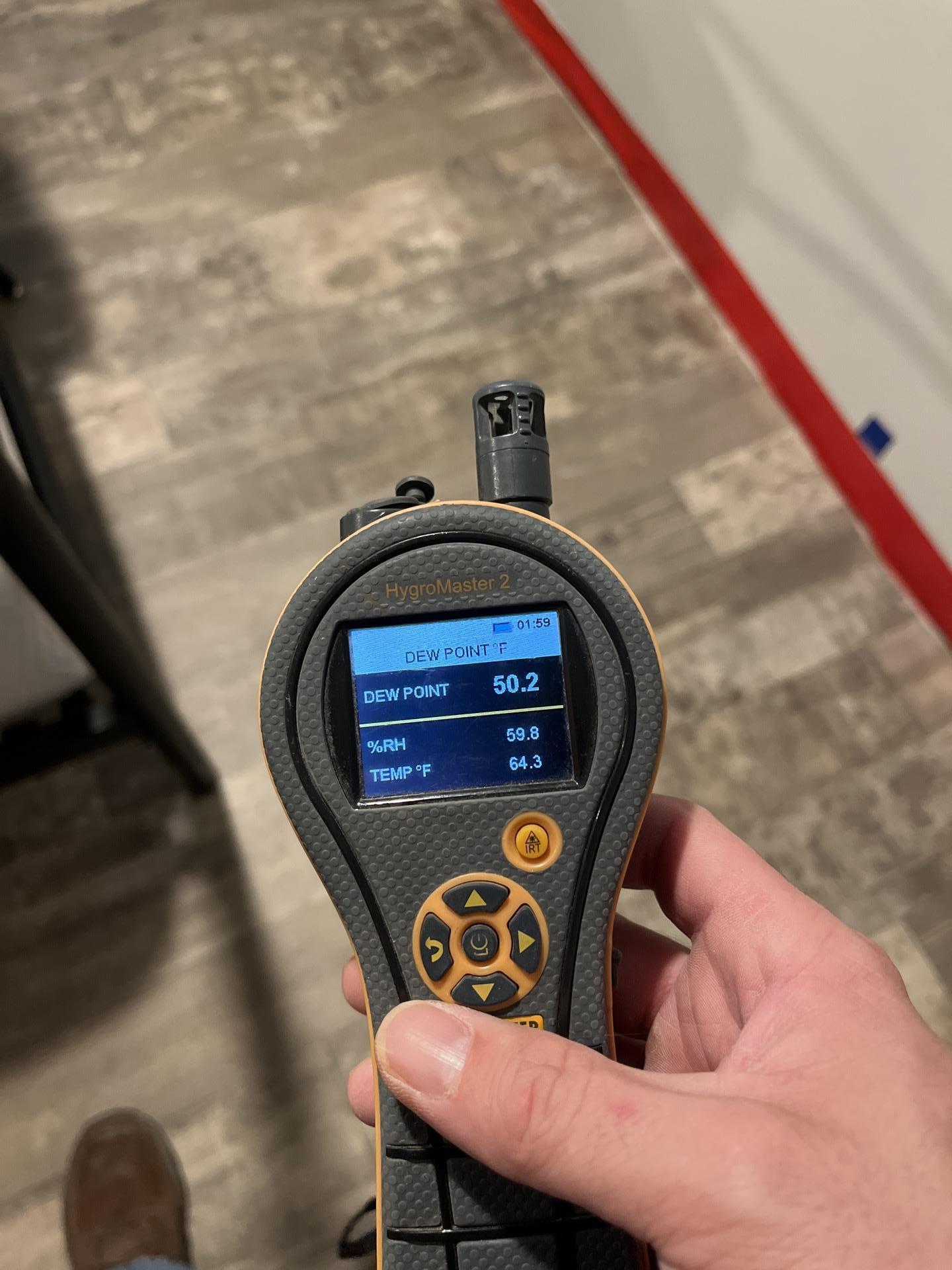 Close-up of a HygroMaster 2 device displaying dew point, relative humidity, and temperature, vital for monitoring moisture levels during water damage drying by Alpha Omega Restoration Pros.