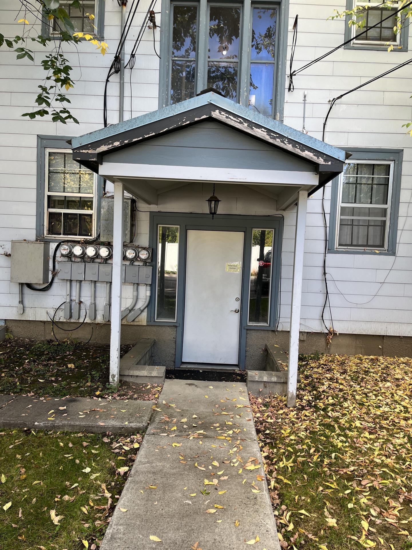 Exterior view of a residential building entrance, showing the areas potentially affected by water damage before restoration by Alpha Omega Restoration Pros.