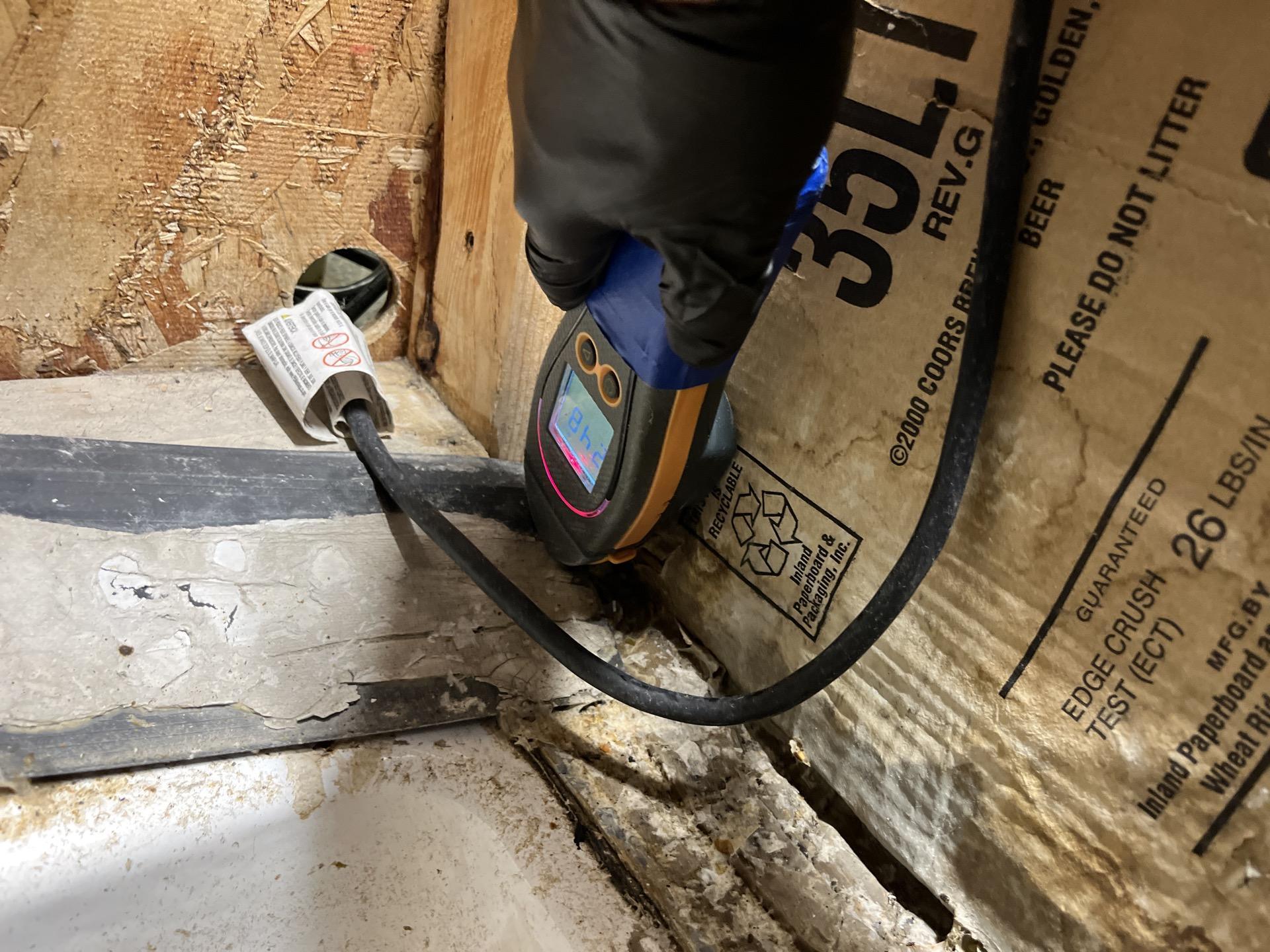 The customer experienced water damage affecting particleboard bottoms in the office and supply closet, along with 6 square feet of affected carpet. While there was no strong odor, moisture detection revealed the extent of the damage.