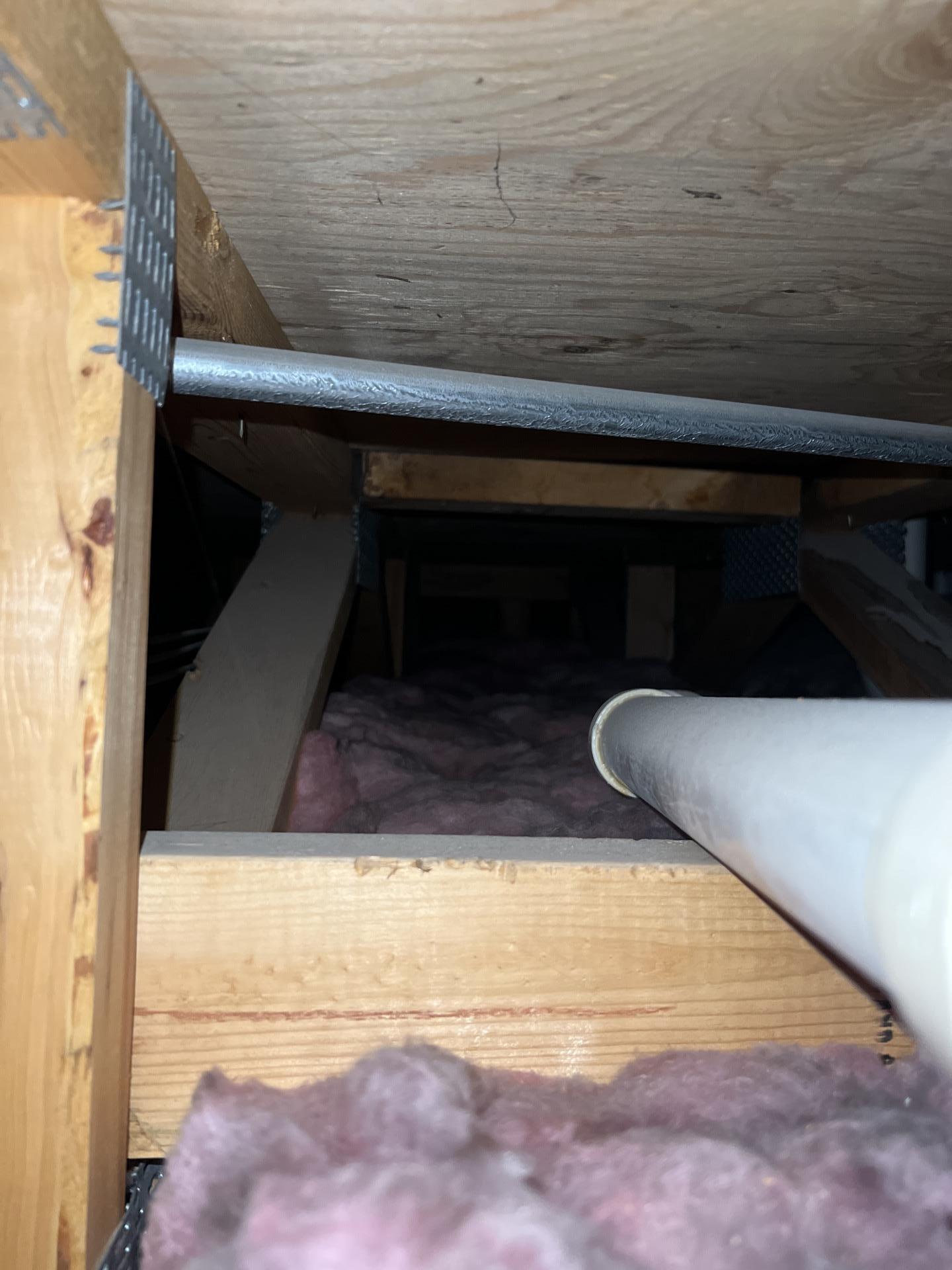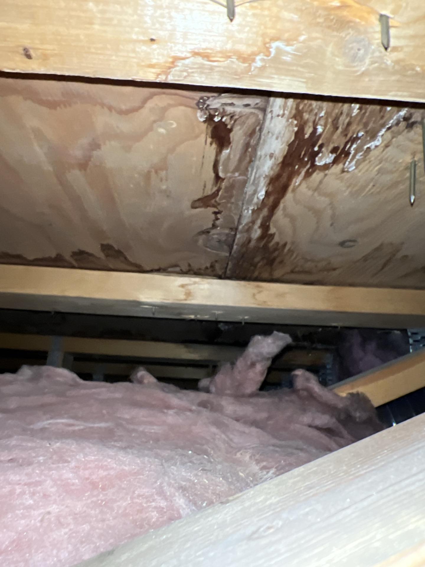 Our team performed a comprehensive inspection of the water-damaged areas, including assessing the attic/floor cavities to assess structural integrity and insulation. Solutions included the demolition and removal of compromised ceiling and drywall materials in the kitchen, and addressing the water intrusion and staining visible on the subfloor, joists, and bathroom walls in the upstairs unit. This allowed for proper drying and preparation for restoration.