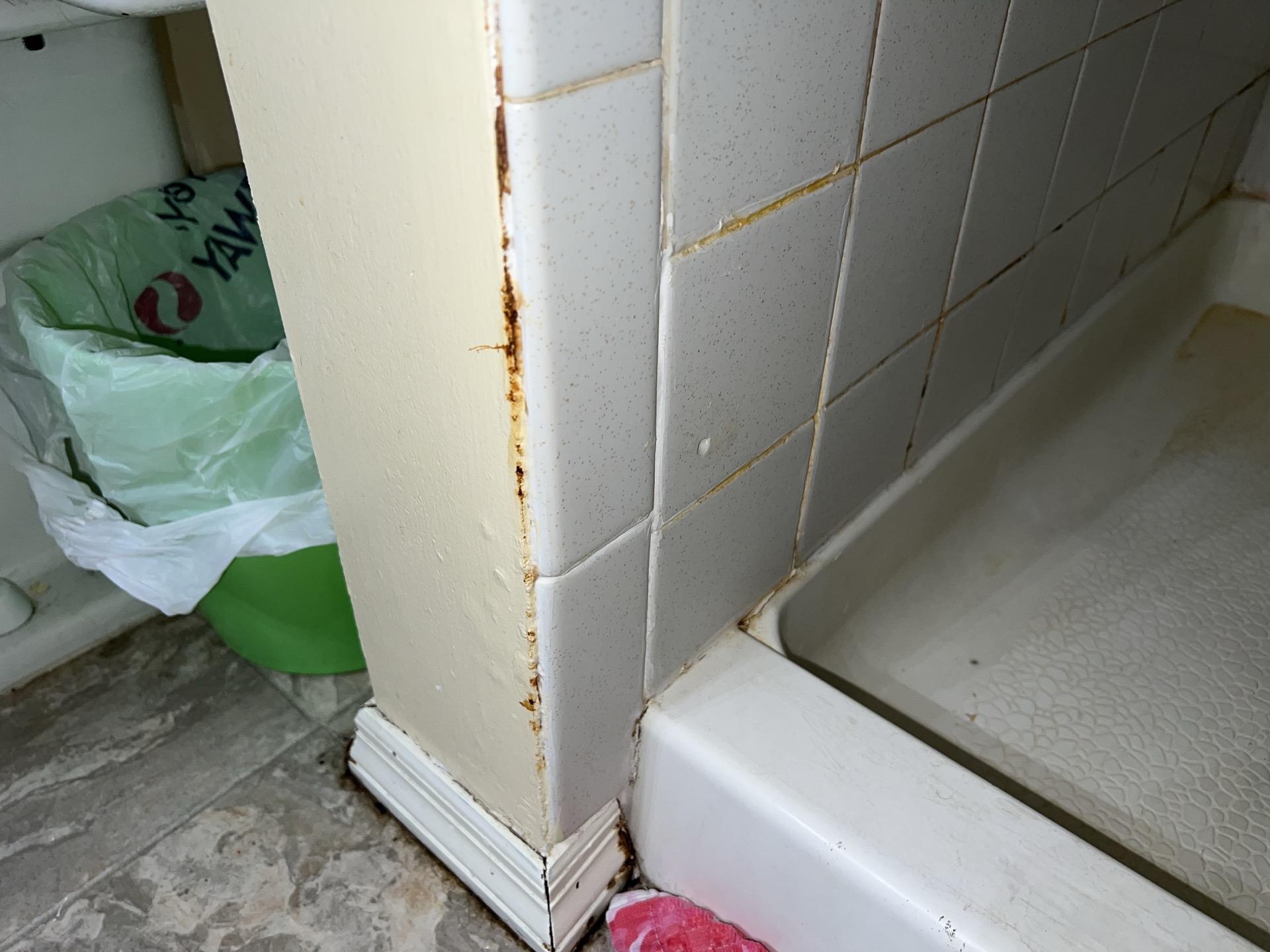 The customer reported water damage affecting their kitchen and an upstairs unit, evidenced by leaks through the ceiling, staining on structural elements, and damage to drywall and bathroom walls.