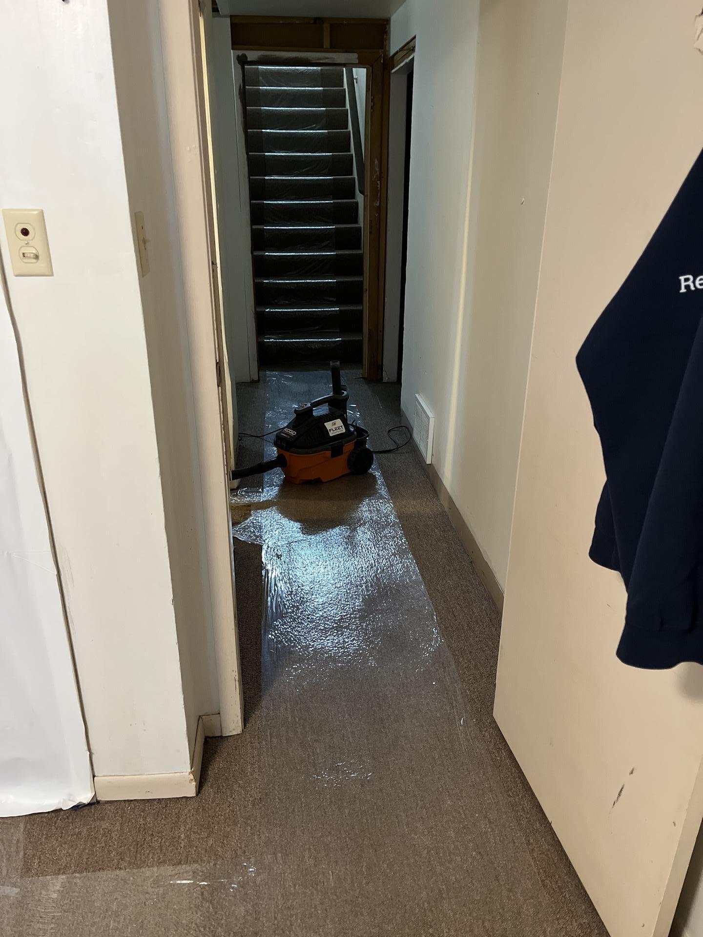 Basement hallway with standing water and a wet vacuum for water extraction.