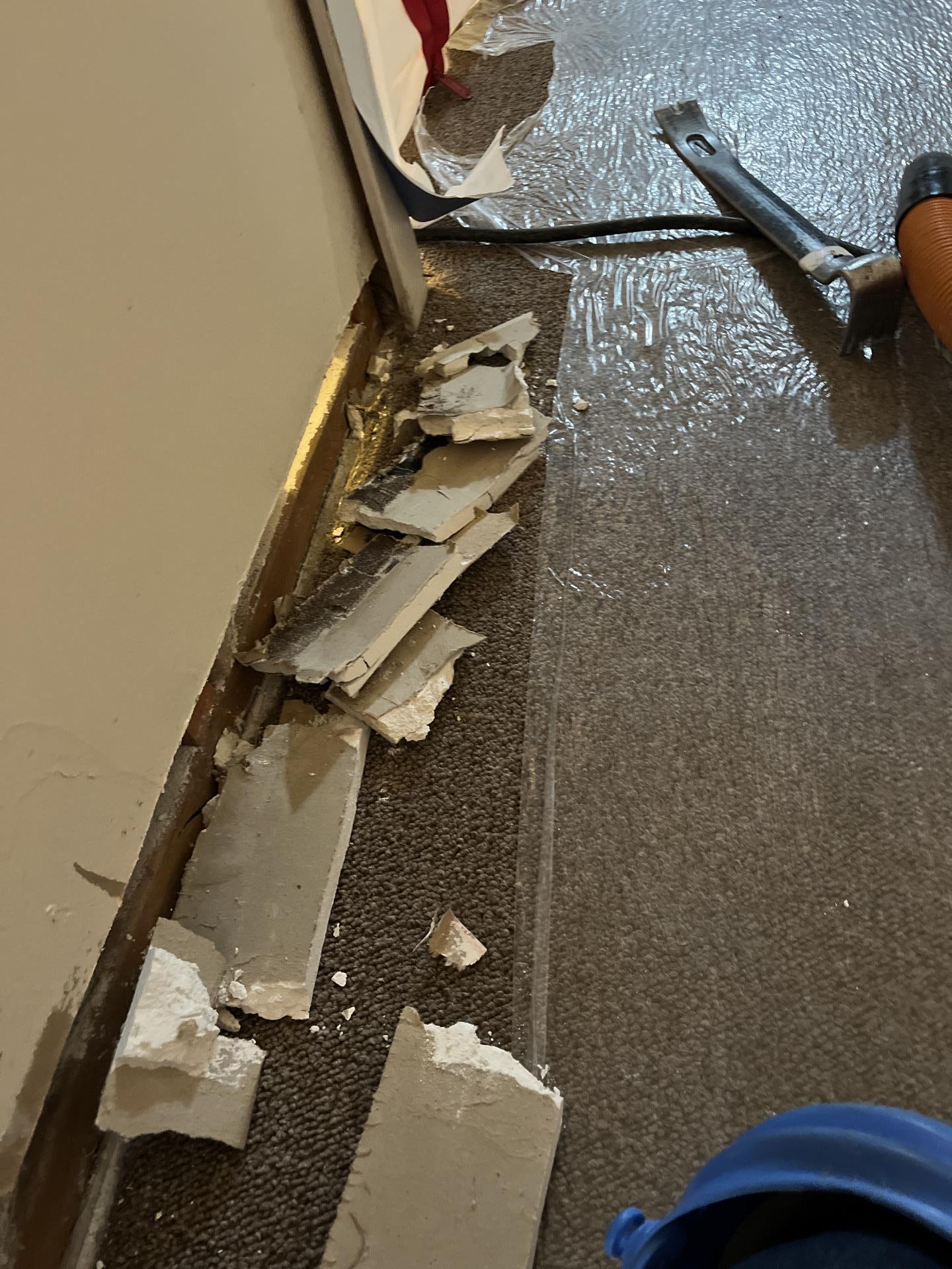 Demolished drywall debris and wet carpet in a basement hallway during water damage restoration.