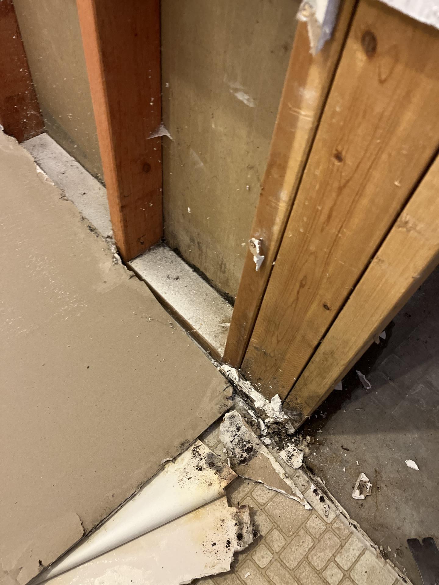Close-up of mold and water damage at the base of a basement wall and floor transition.