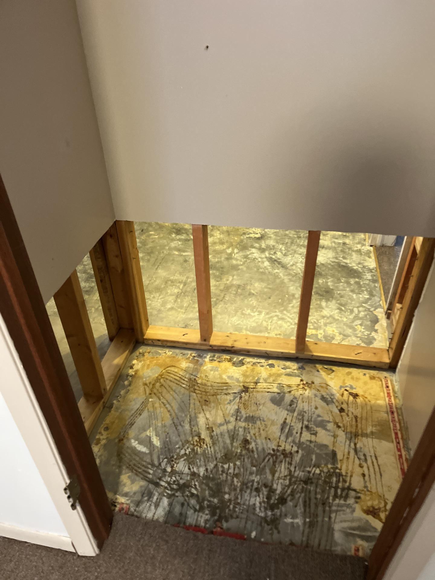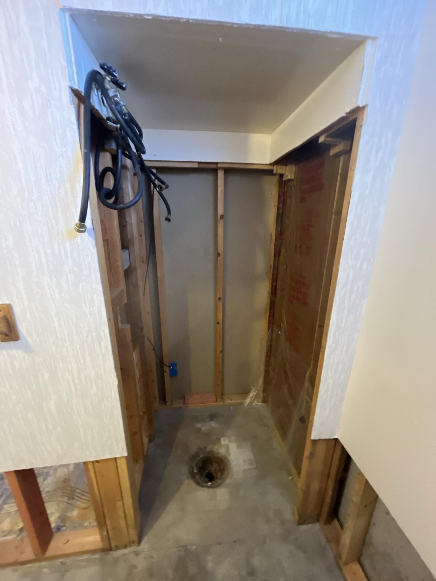 Basement bathroom or closet area after demolition, showing exposed studs and floor drain, ready for mold remediation.