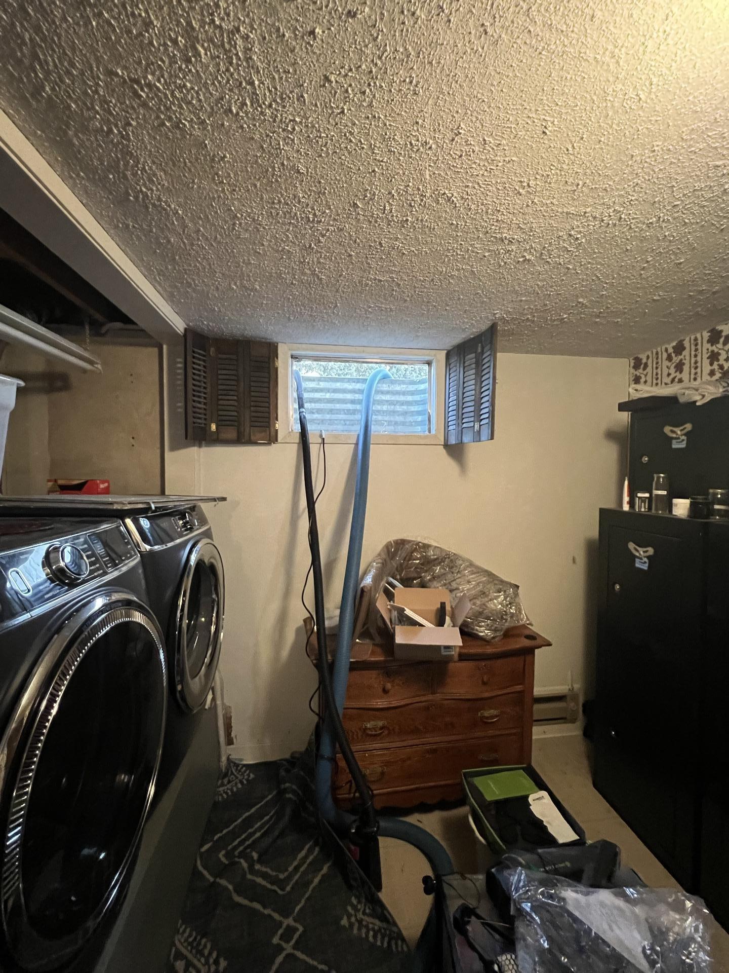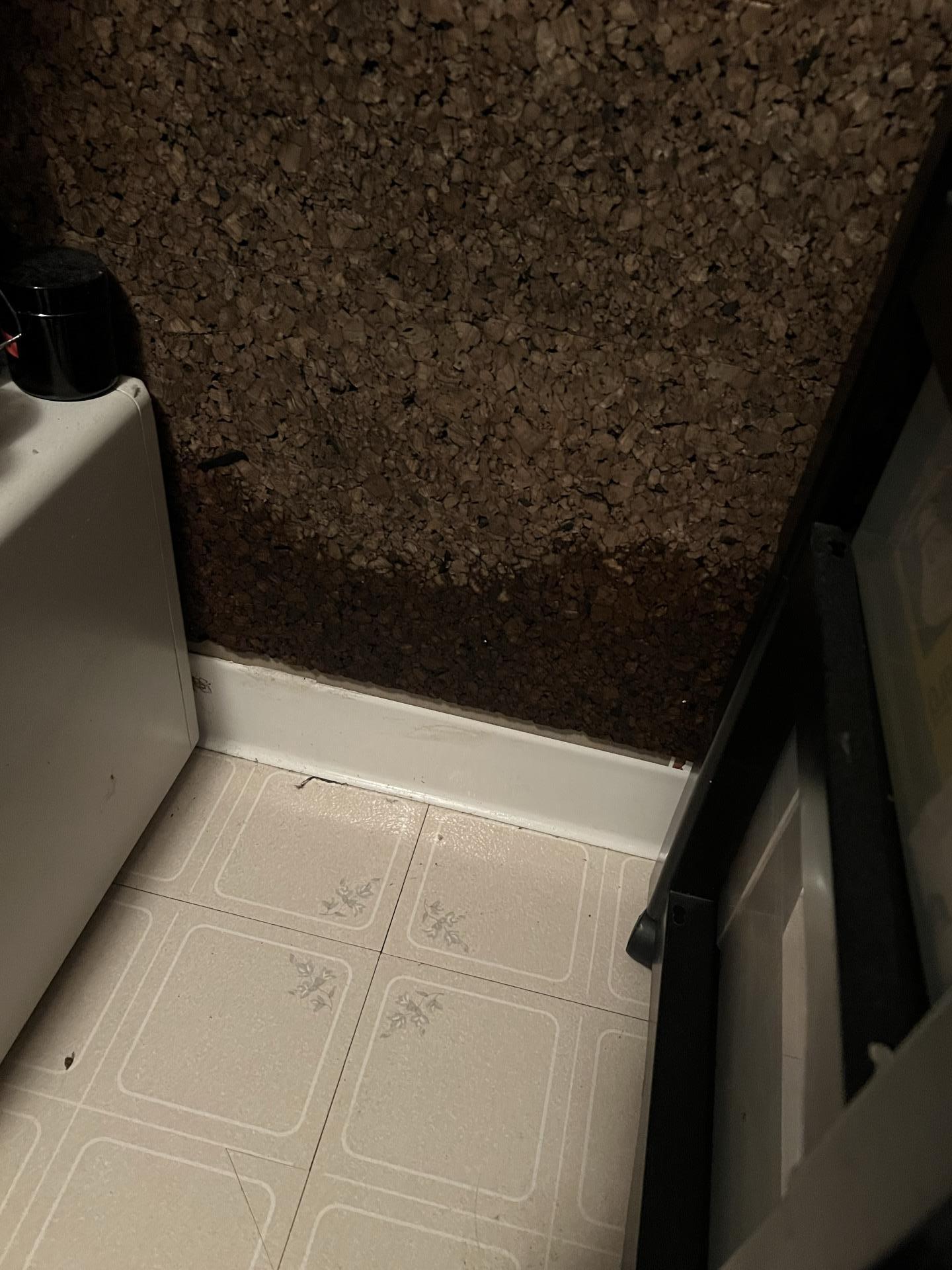 Visible water damage and staining on the lower portion of a textured wall above a baseboard, suggesting water intrusion in a laundry room or closet area.