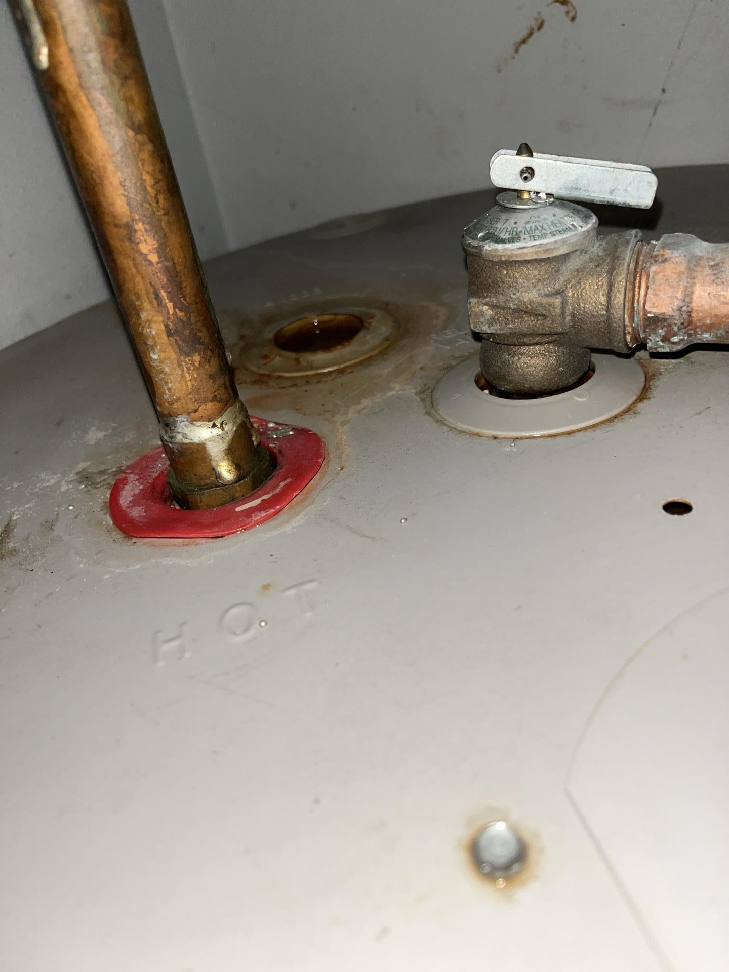 Close-up view of a corroded hot water heater connection, showing clear signs of leakage and rust, indicating the source of the water damage.