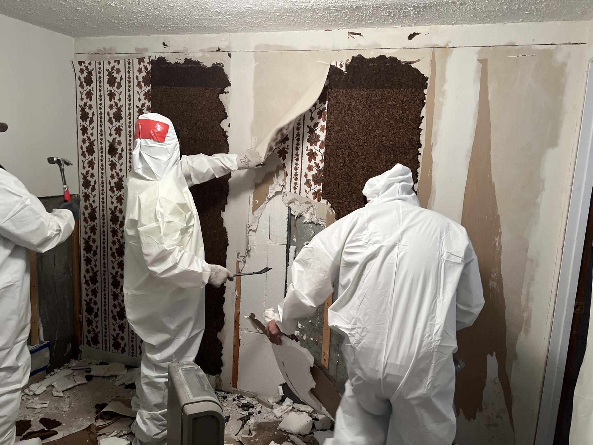 Restoration technicians in white full-body protective suits performing demolition, removing damaged wallpaper and compromised wall materials in a water-damaged room.