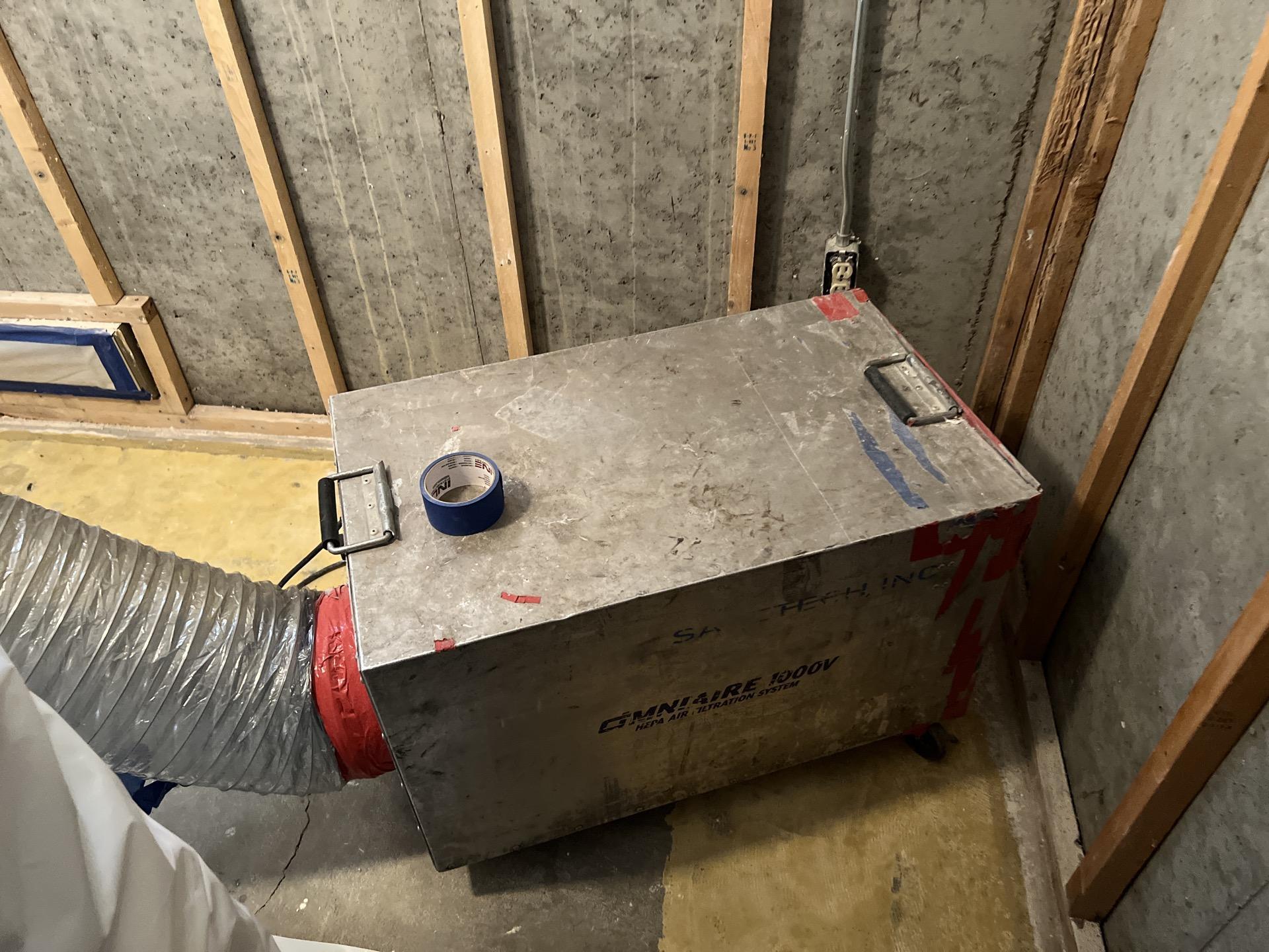 An industrial HEPA air scrubber with flexible ducting operating in a basement with exposed studs and concrete walls, used for air purification during water damage remediation.