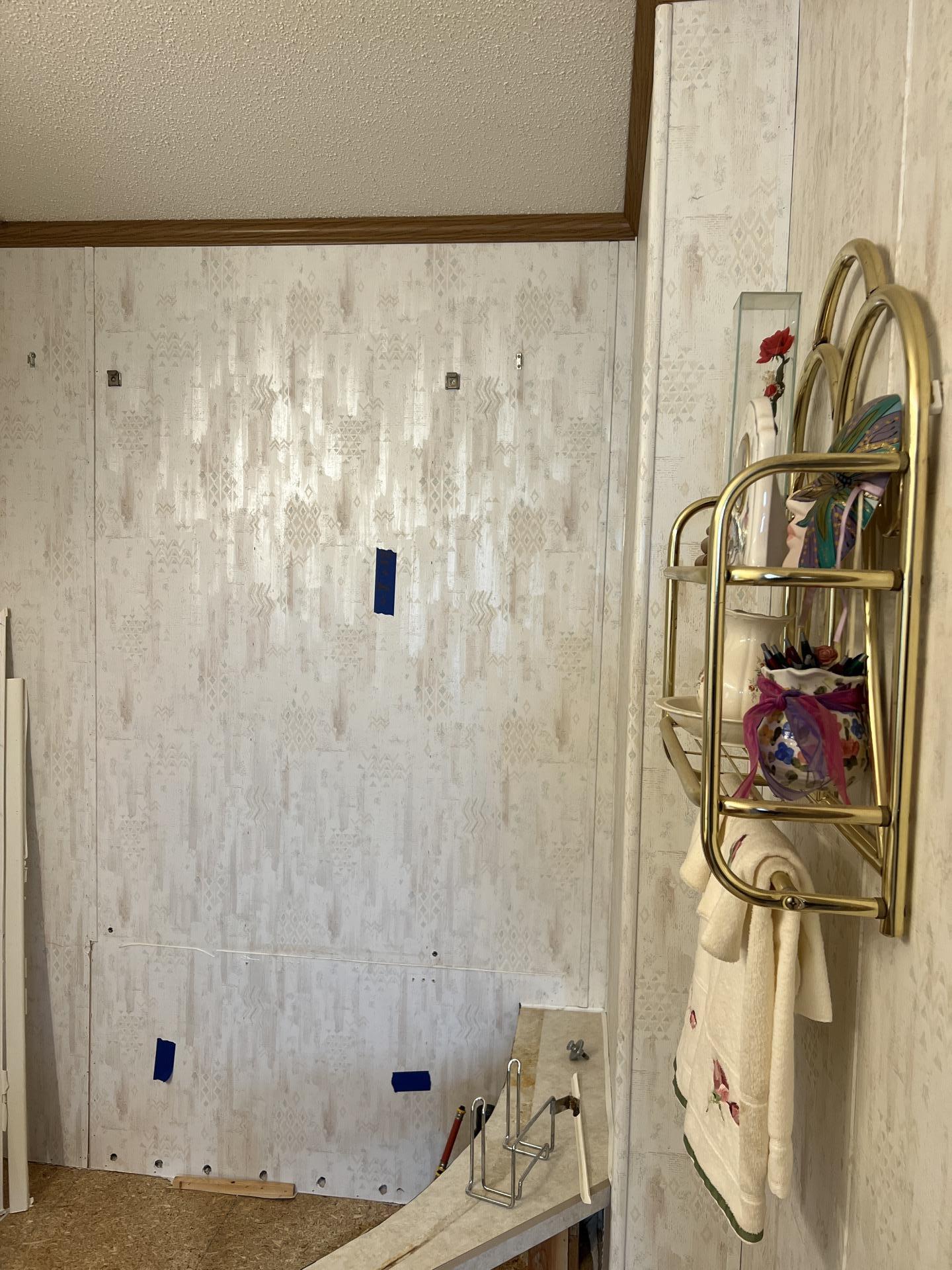 Bathroom wall after the removal of damaged paneling, revealing sub-layers as part of water damage restoration efforts.