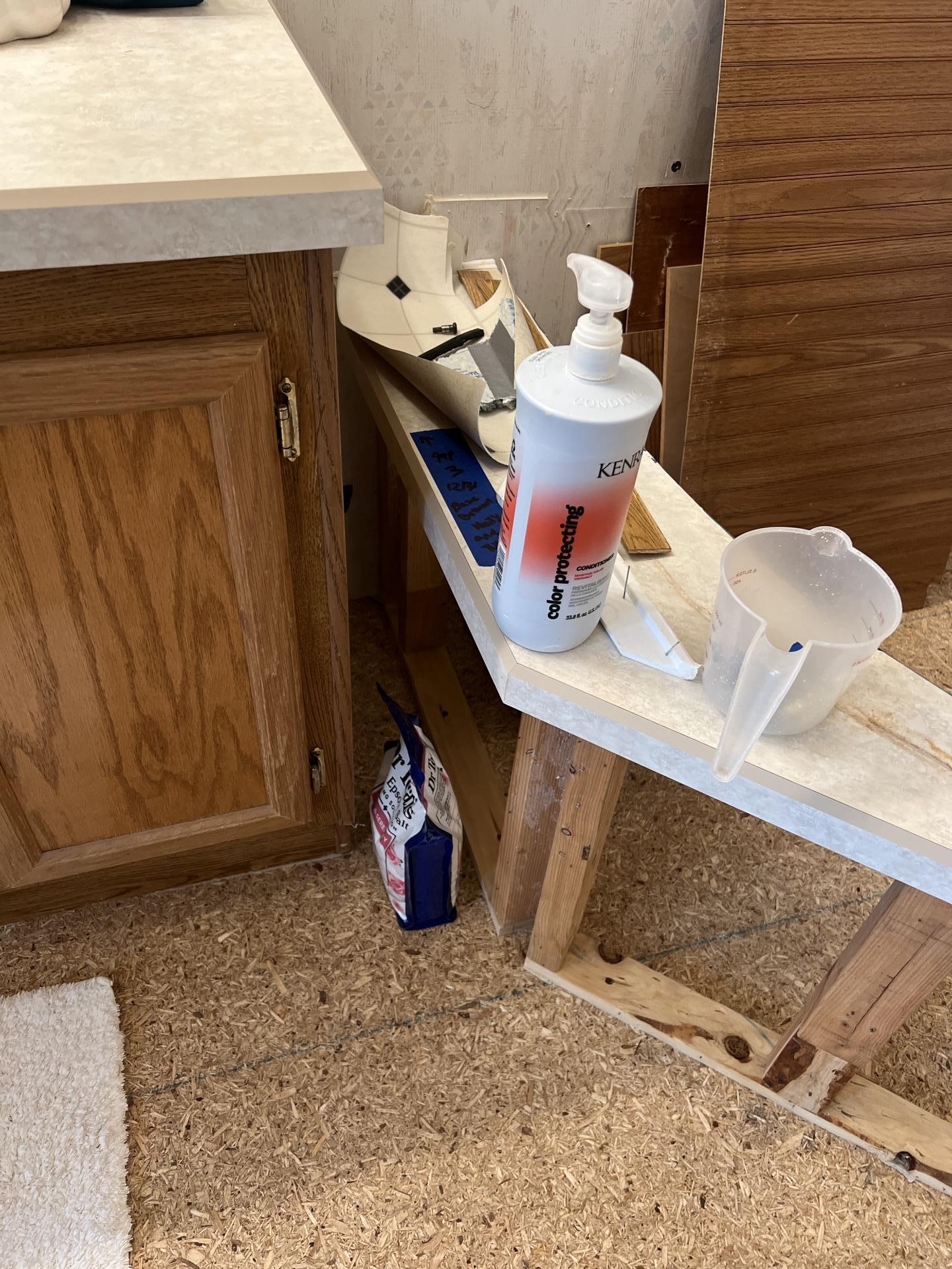 Close-up of the exposed subfloor near a dismantled vanity structure during a water damage cleanup project.