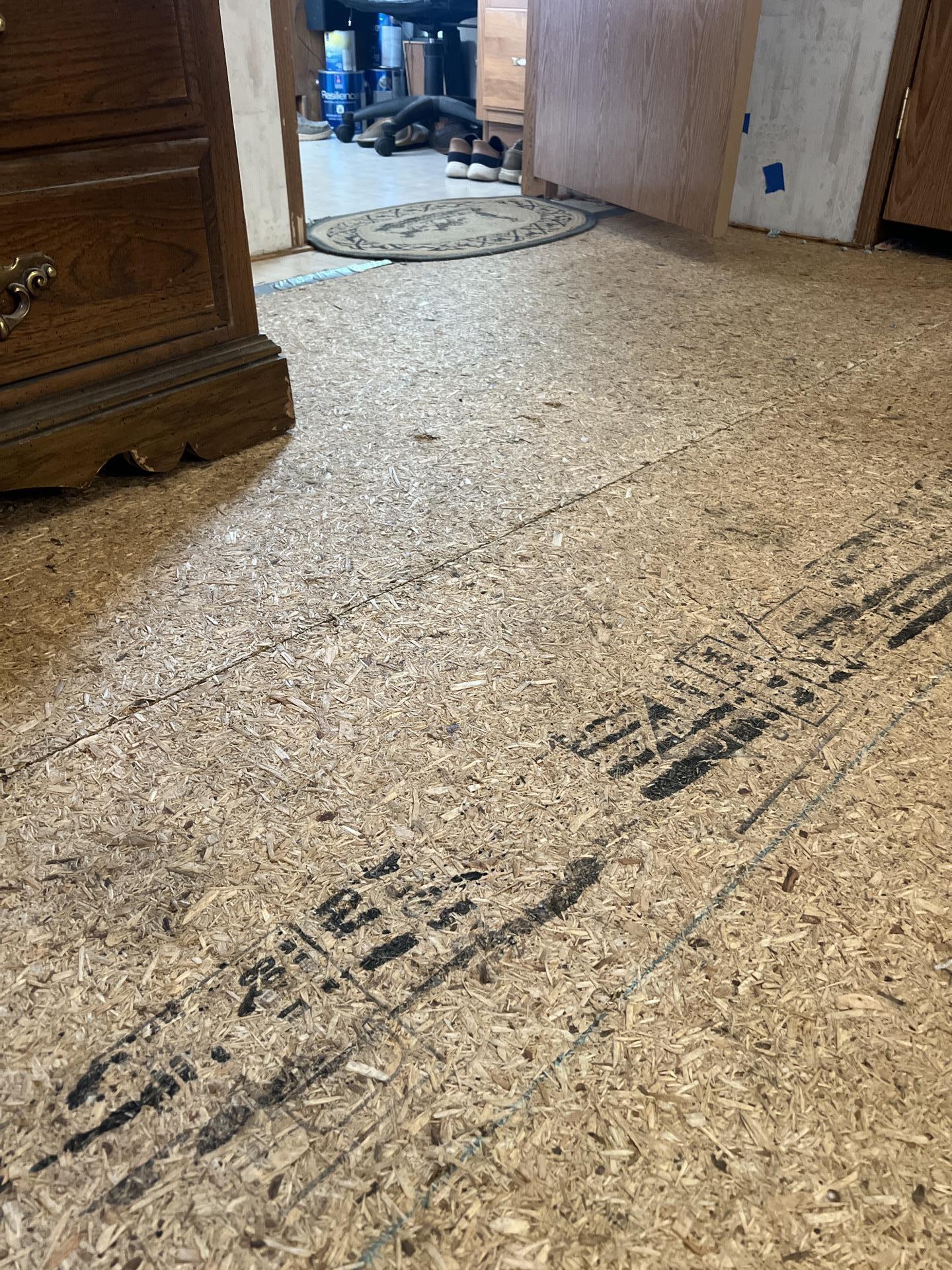 Exposed OSB subfloor in a hallway after water damage remediation, showing the area cleared for restoration.