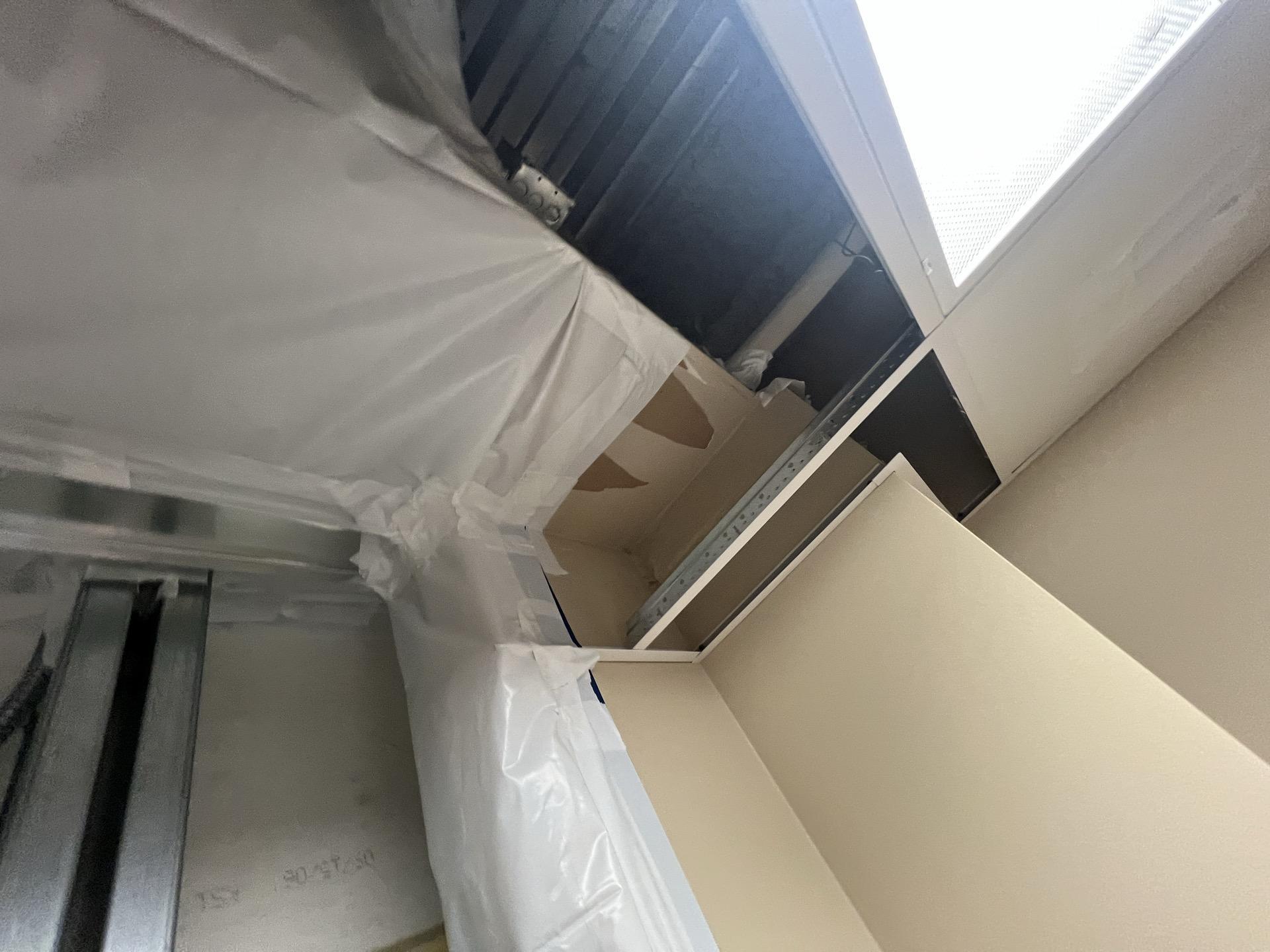 View of a commercial bathroom ceiling undergoing water damage demolition, with plastic sheeting for containment and exposed structural elements.