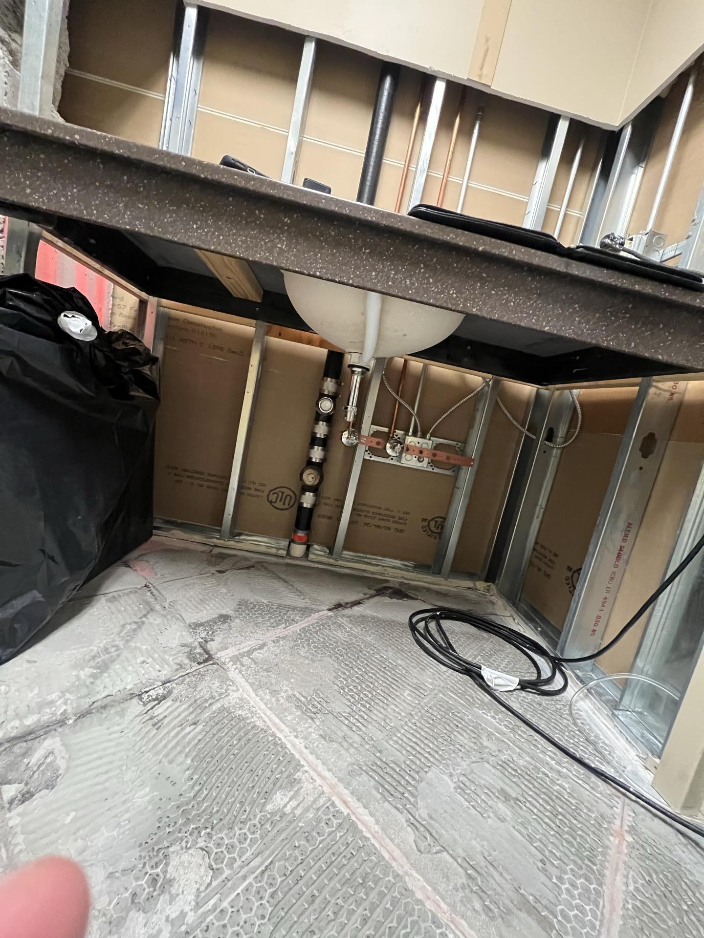 Underside view of a commercial sink vanity area after demolition due to water damage, showing exposed plumbing and structural framing.