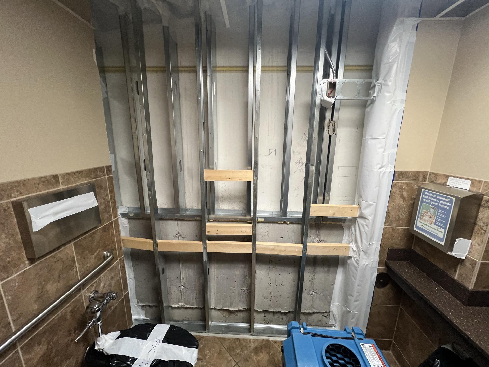 Commercial restroom wall after water damage demolition, revealing metal studs, wooden bracing, and a blue air mover used for drying the affected area.