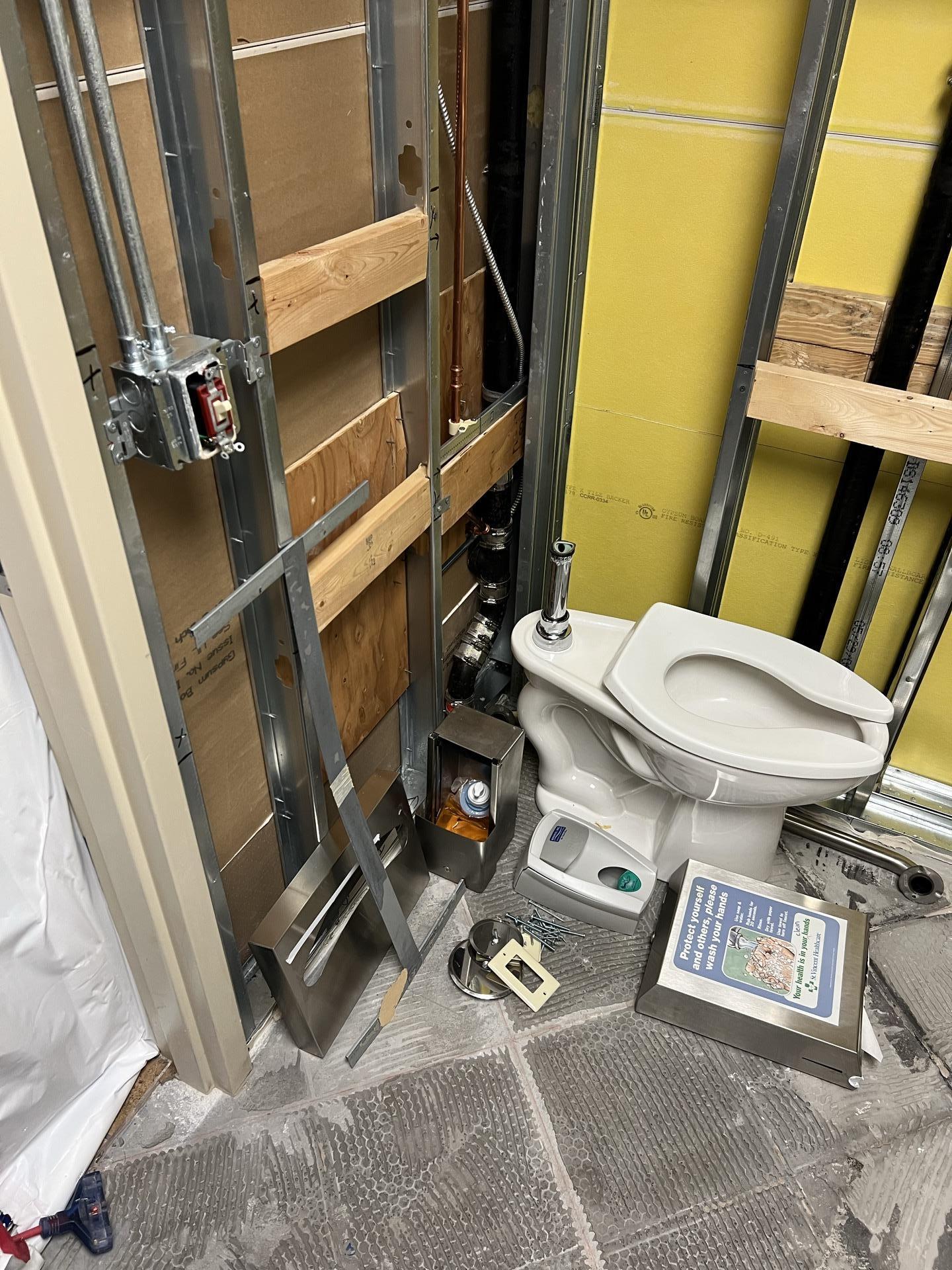 Interior of a commercial bathroom after water damage demolition, with the toilet removed, exposing plumbing, electrical conduits, and stripped walls.