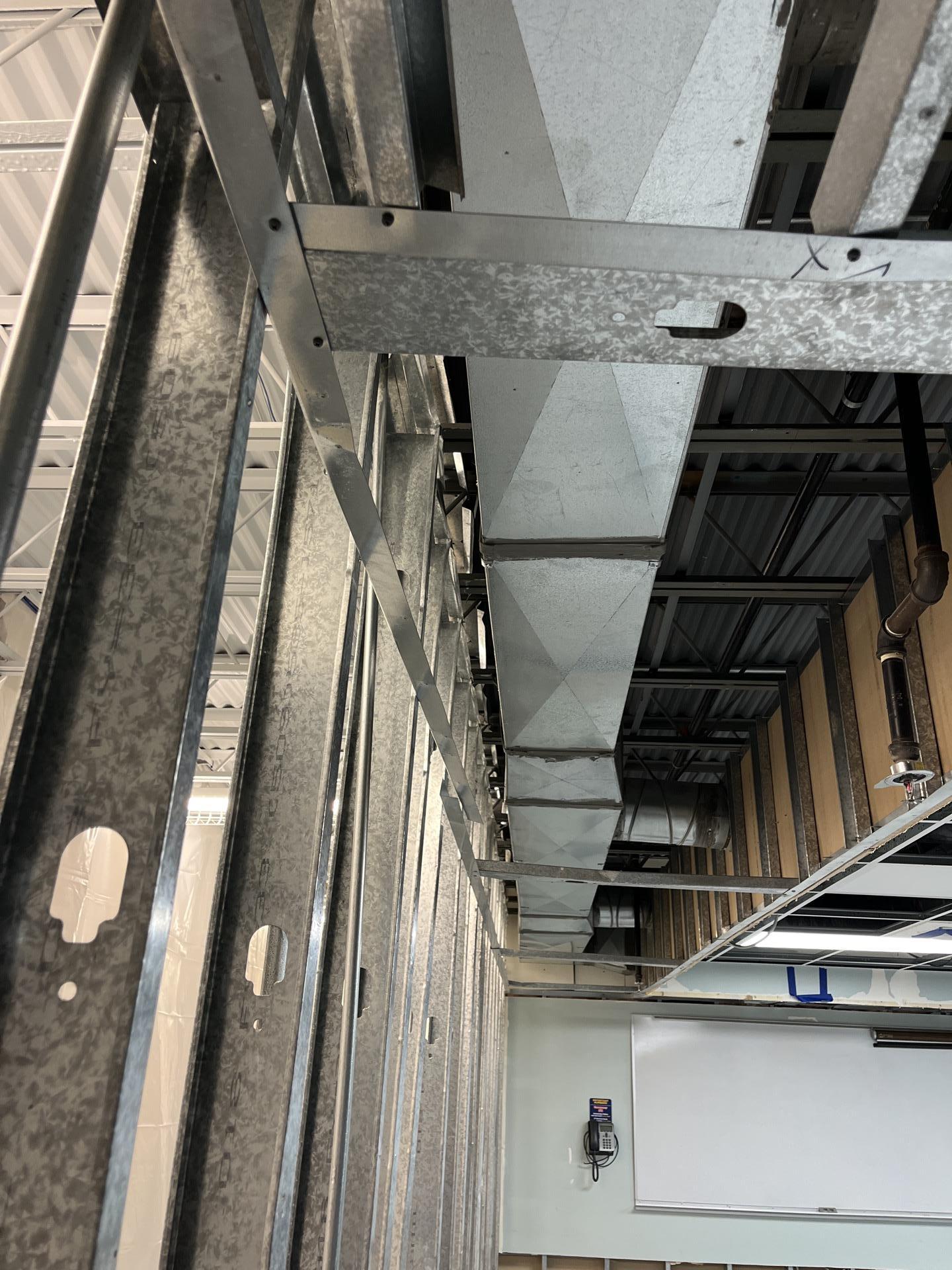 Overhead view of exposed metal framing and ductwork in a commercial building during renovation or water damage assessment.