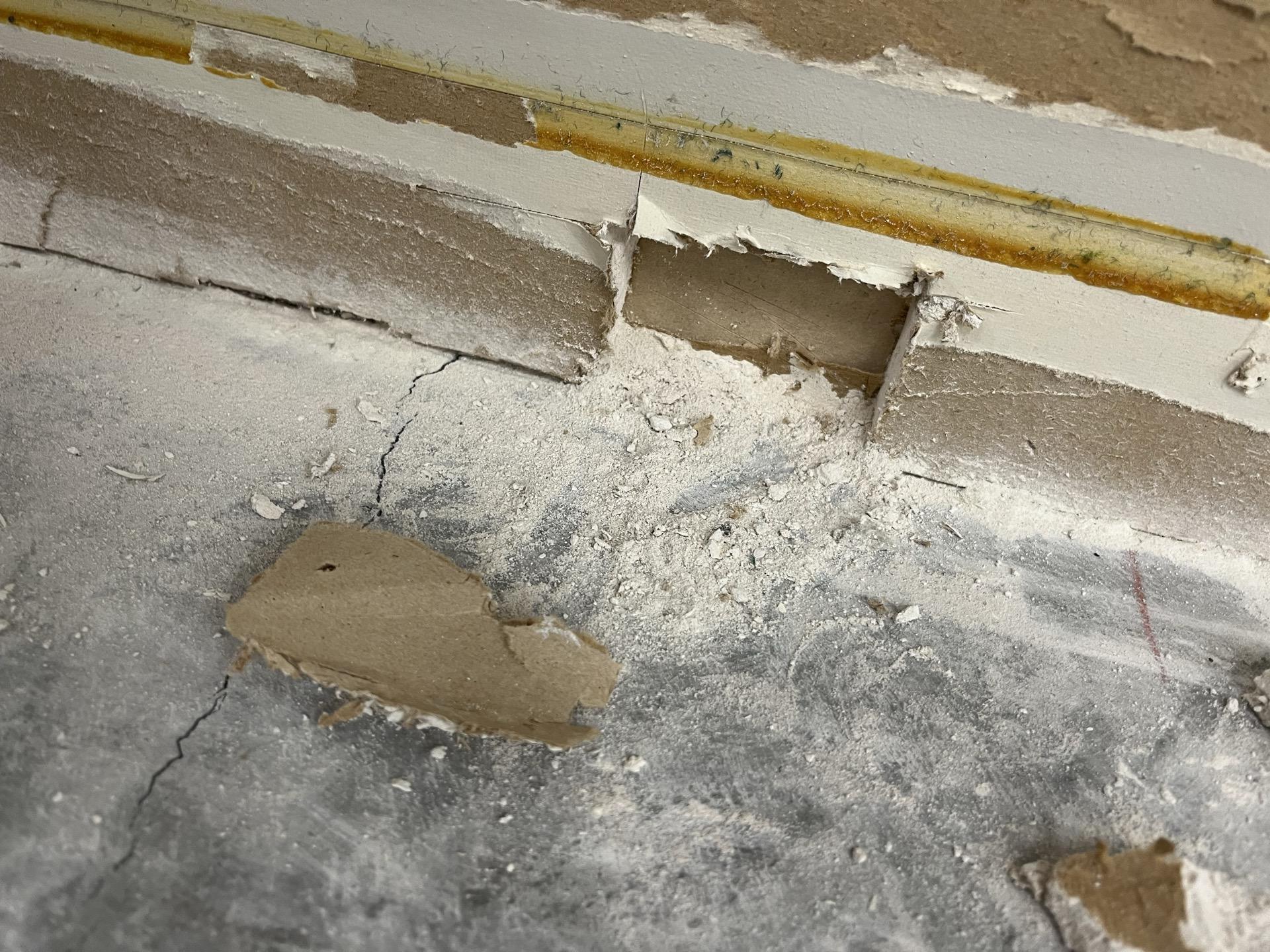 Close-up of severely water-damaged drywall and baseboard showing crumbling material and visible water lines near the floor.