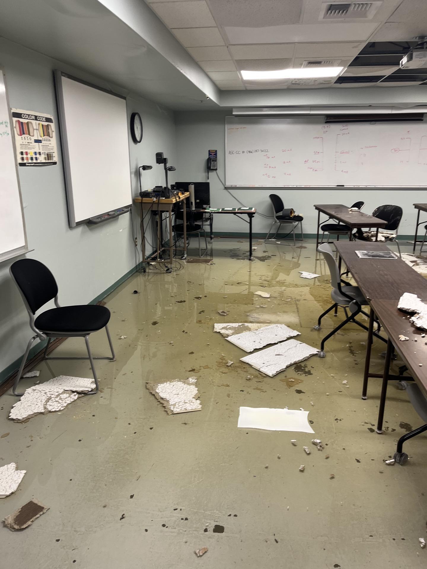 The customer experienced significant water damage in multiple areas of a facility, specifically a classroom (computer lab), a first-floor electrical systems room, and a hallway/kitchen nook. The damage included standing water, compromised flooring, damaged ceilings, and structural components.