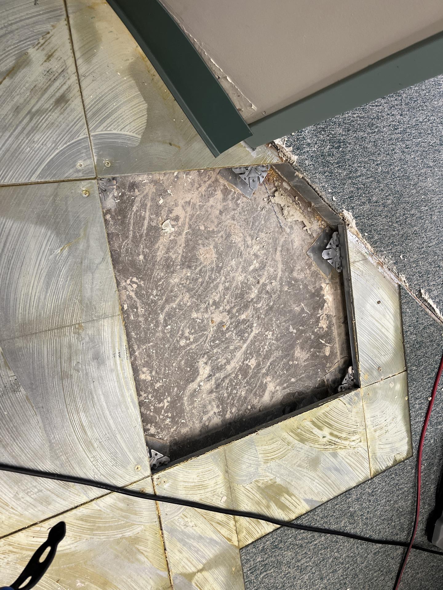 Section of commercial flooring removed to expose the concrete subfloor, part of water damage remediation process.