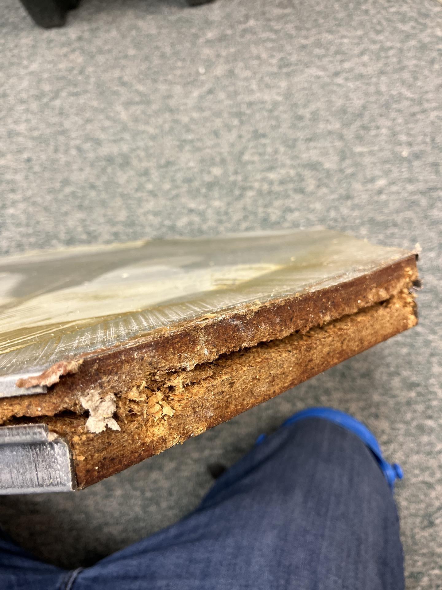 Close-up of swollen and disintegrated particle board, indicative of severe water damage to furniture or structural elements.