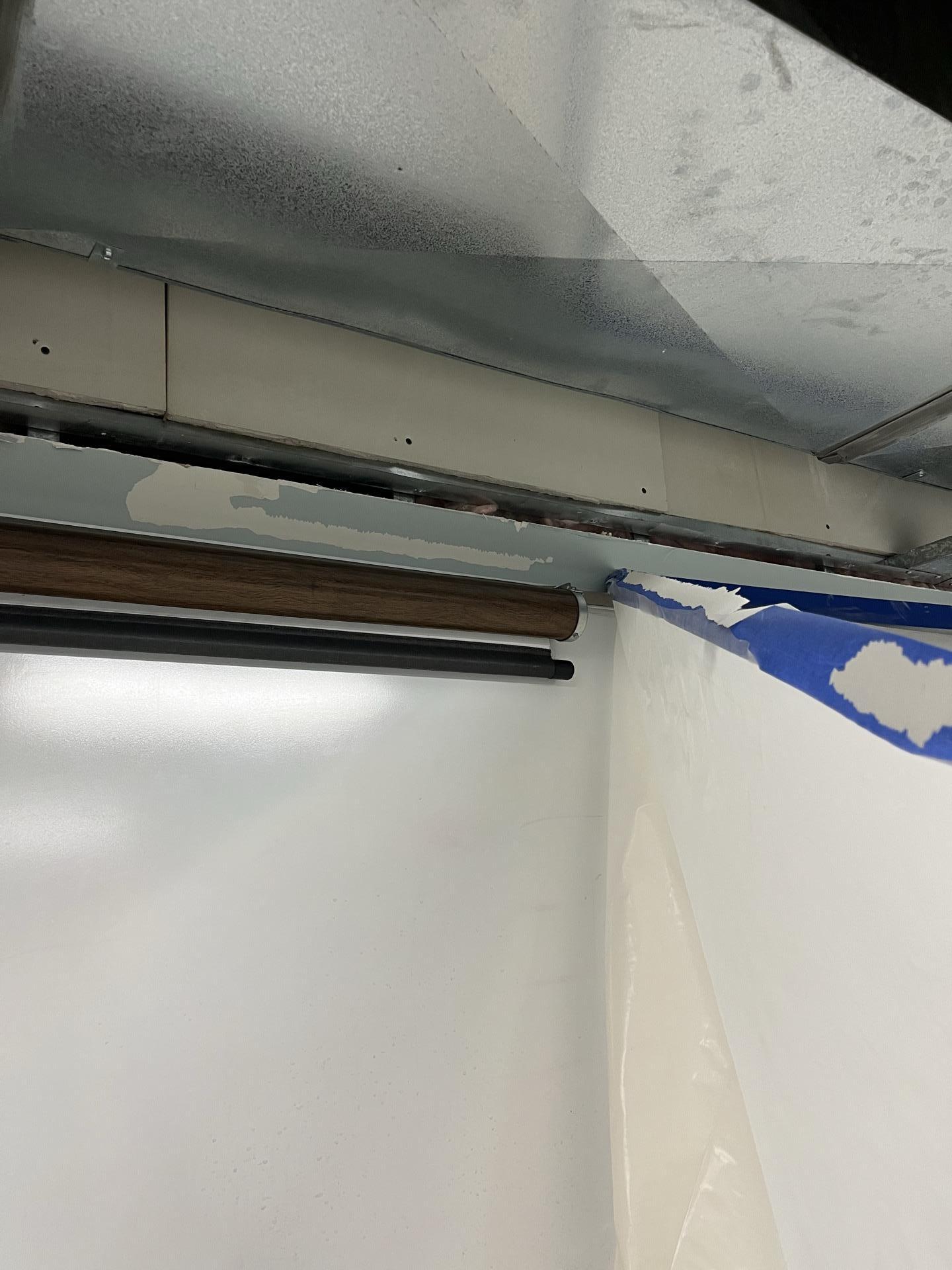 Newly painted or repaired wall with blue painter's tape and updated ductwork above, indicating restoration progress in a commercial space.