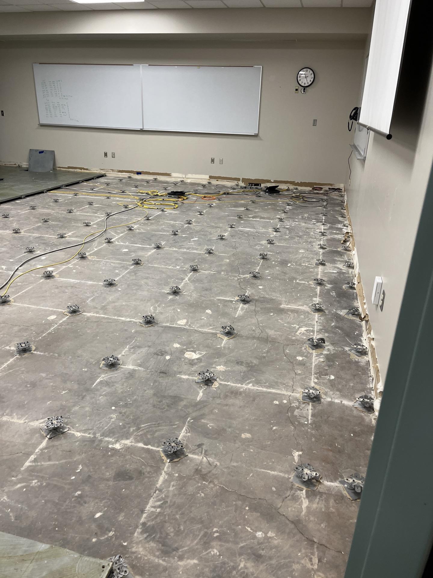 Classroom floor during water damage restoration, showing exposed subfloor with specialized drying equipment to remove moisture and dry concrete.