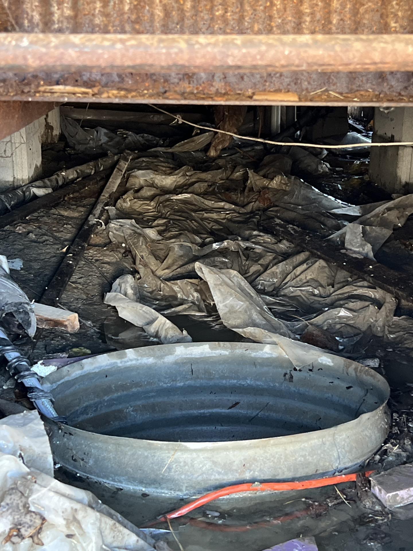 Interior view of a heavily waterlogged mobile home crawlspace, featuring a large metal basin for water collection and saturated plastic sheeting, highlighting the extensive water extraction efforts.
