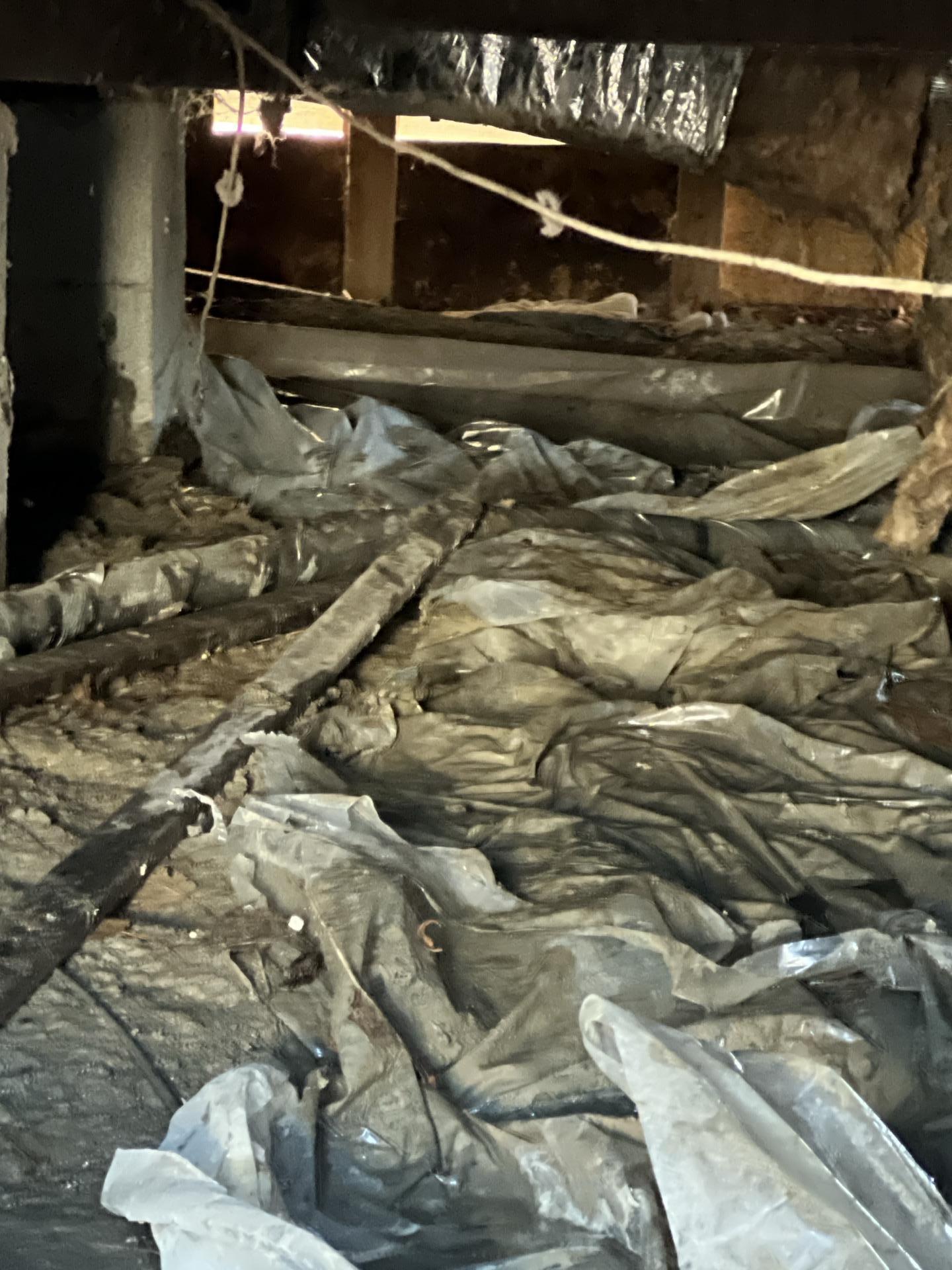 Deeper view inside the water-damaged crawlspace, showing severely saturated insulation or vapor barrier materials on the ground, indicating extensive moisture intrusion and the need for thorough drying.