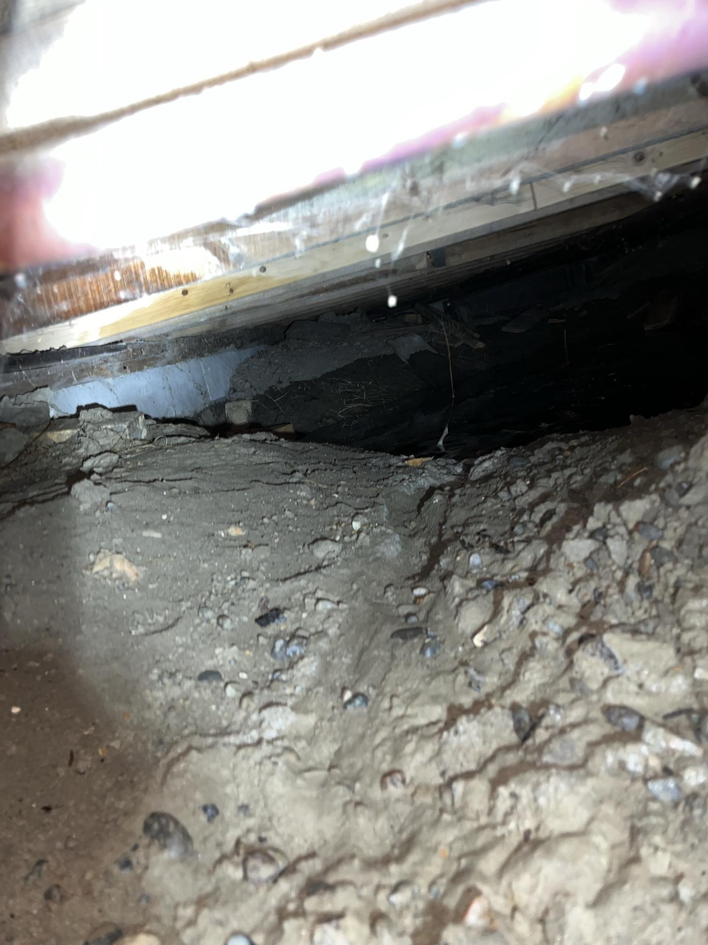 A view of the muddy and uneven floor within a crawlspace, highlighting the extent of water damage before complete restoration.