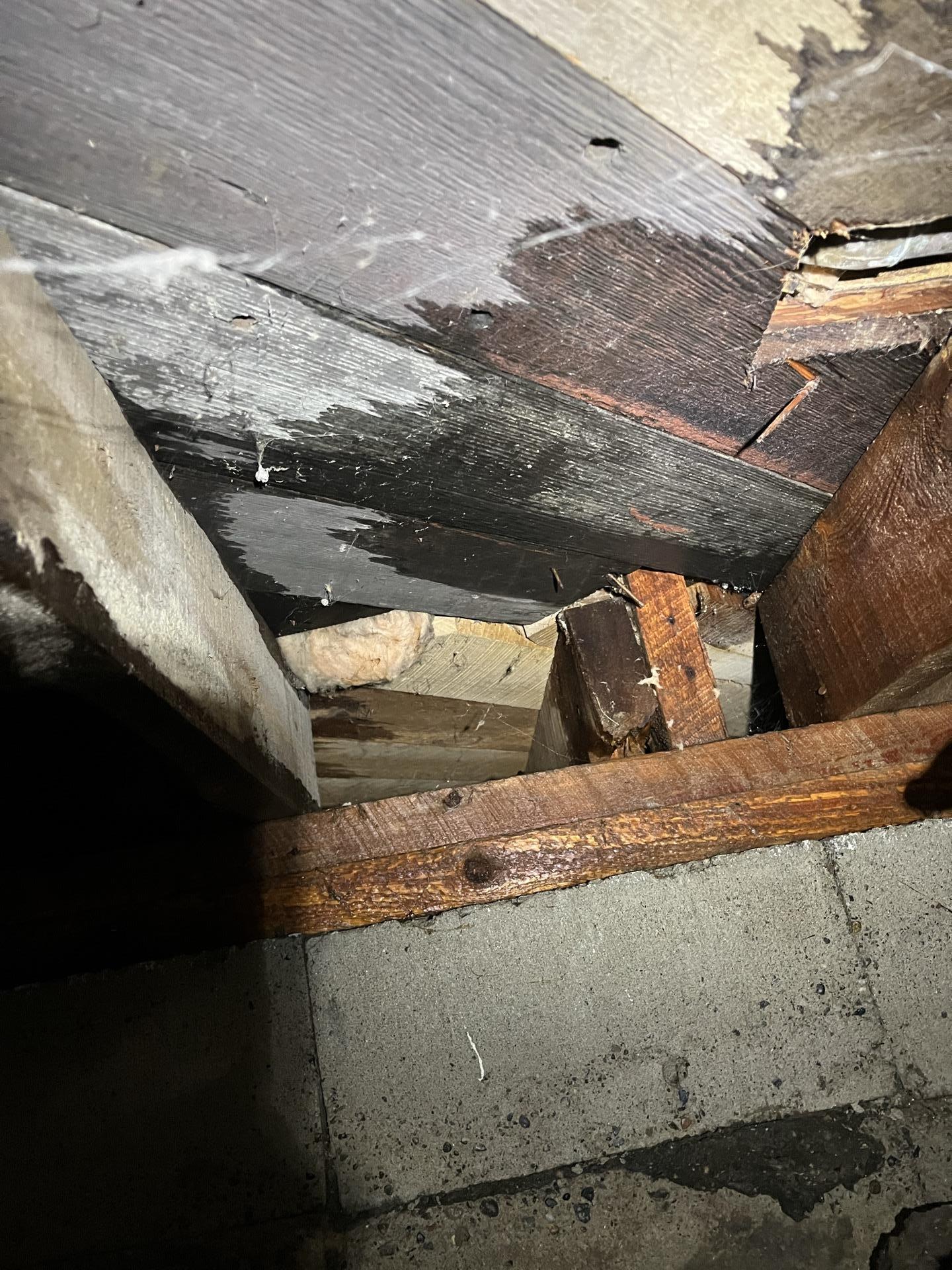 Close-up of water-damaged wooden joists and subfloor components in a crawlspace, showing saturation and potential structural impact.