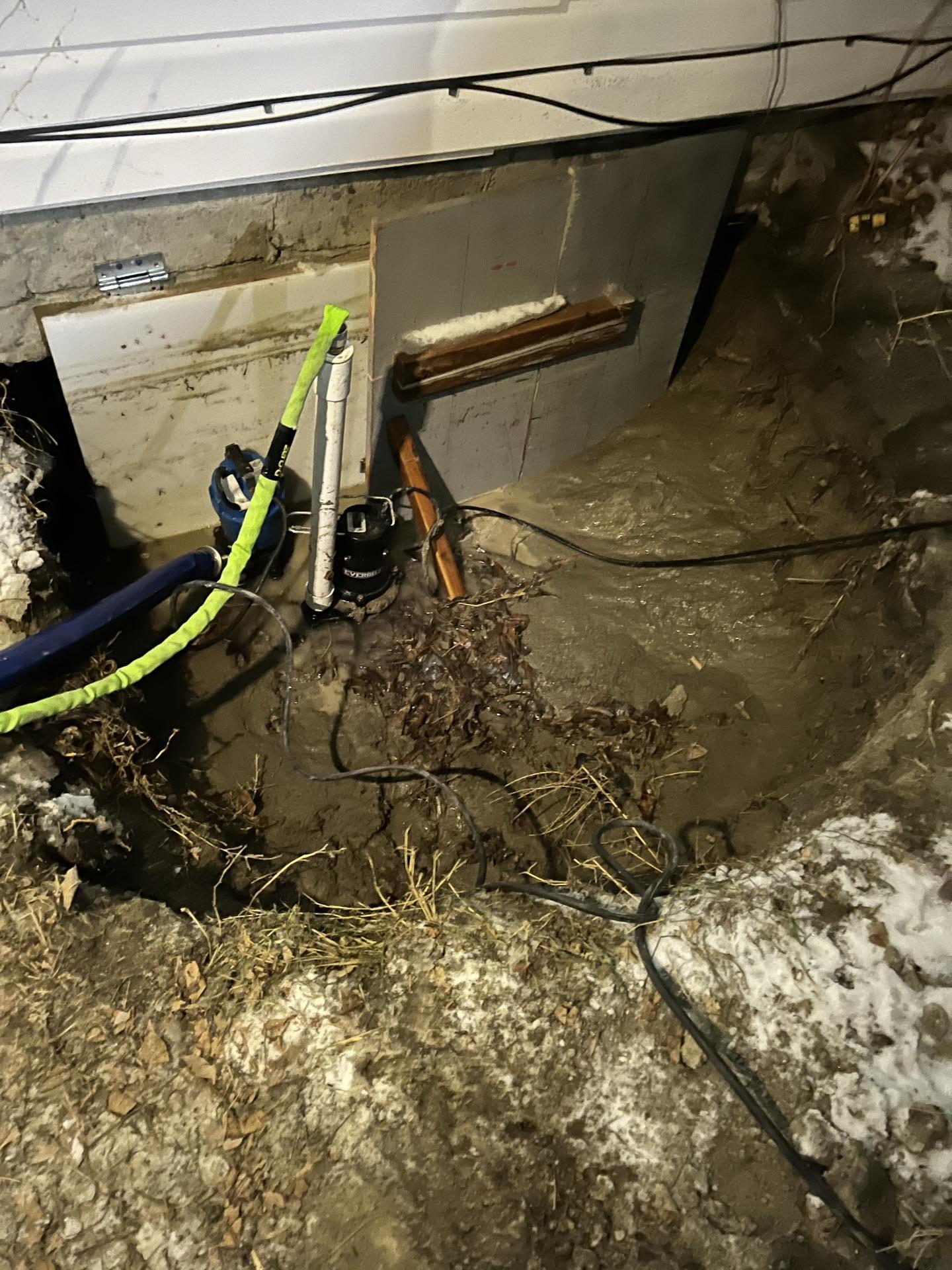Water extraction actively underway in a crawlspace, featuring a sump pump and drainage hoses removing floodwater and mud.