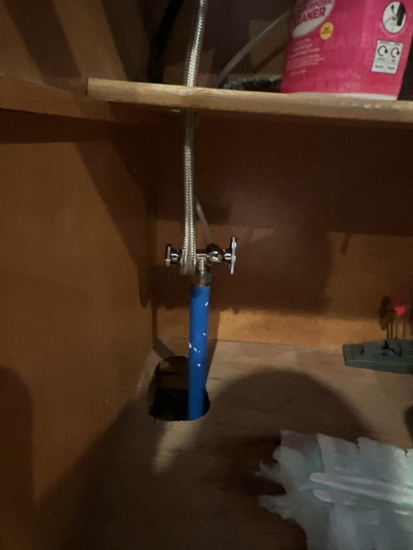Close-up of kitchen cabinet interior showing plumbing lines with shut-off valve, indicating a potential water leak source or repaired area during water damage restoration.