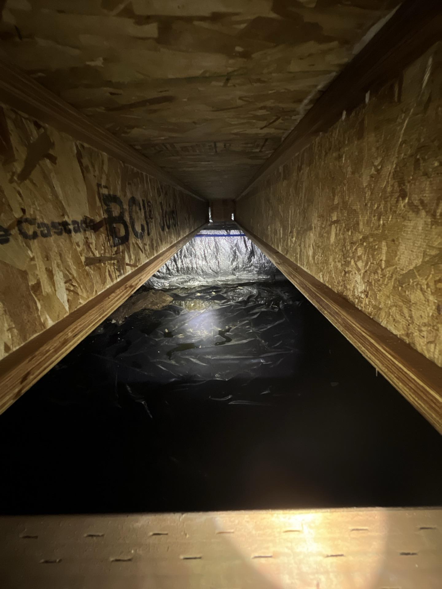 View inside a crawlspace showing wooden floor joists and a newly installed black vapor barrier, indicating completed crawlspace encapsulation or moisture control measures.