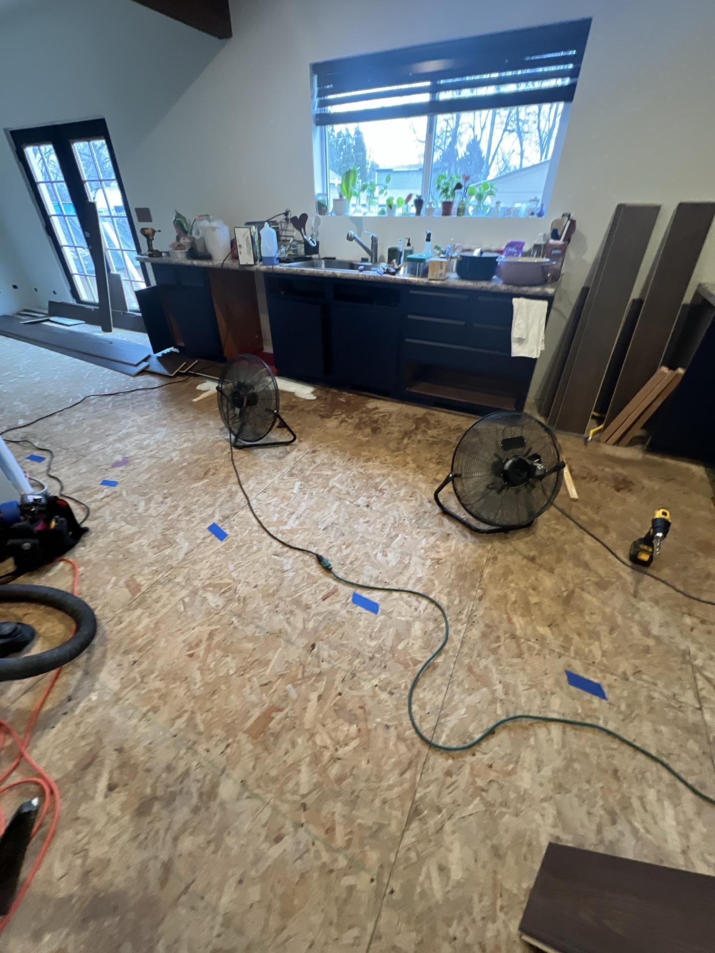 Kitchen undergoing water damage restoration, showing exposed subfloor, industrial drying fans, and new flooring materials ready for installation after water removal.