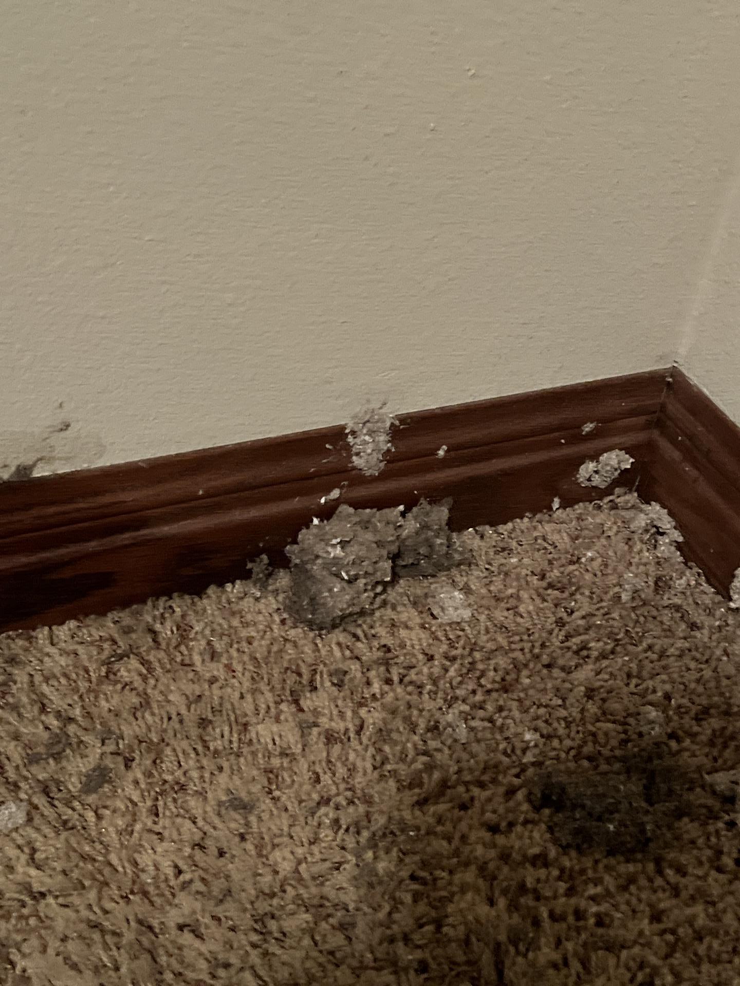 The customer experienced significant water damage issues affecting both their office interior and exterior. This included visible damage to the office ceiling, exposing insulation, and water impact on the carpet and baseboards, indicating a substantial leak or intrusion.