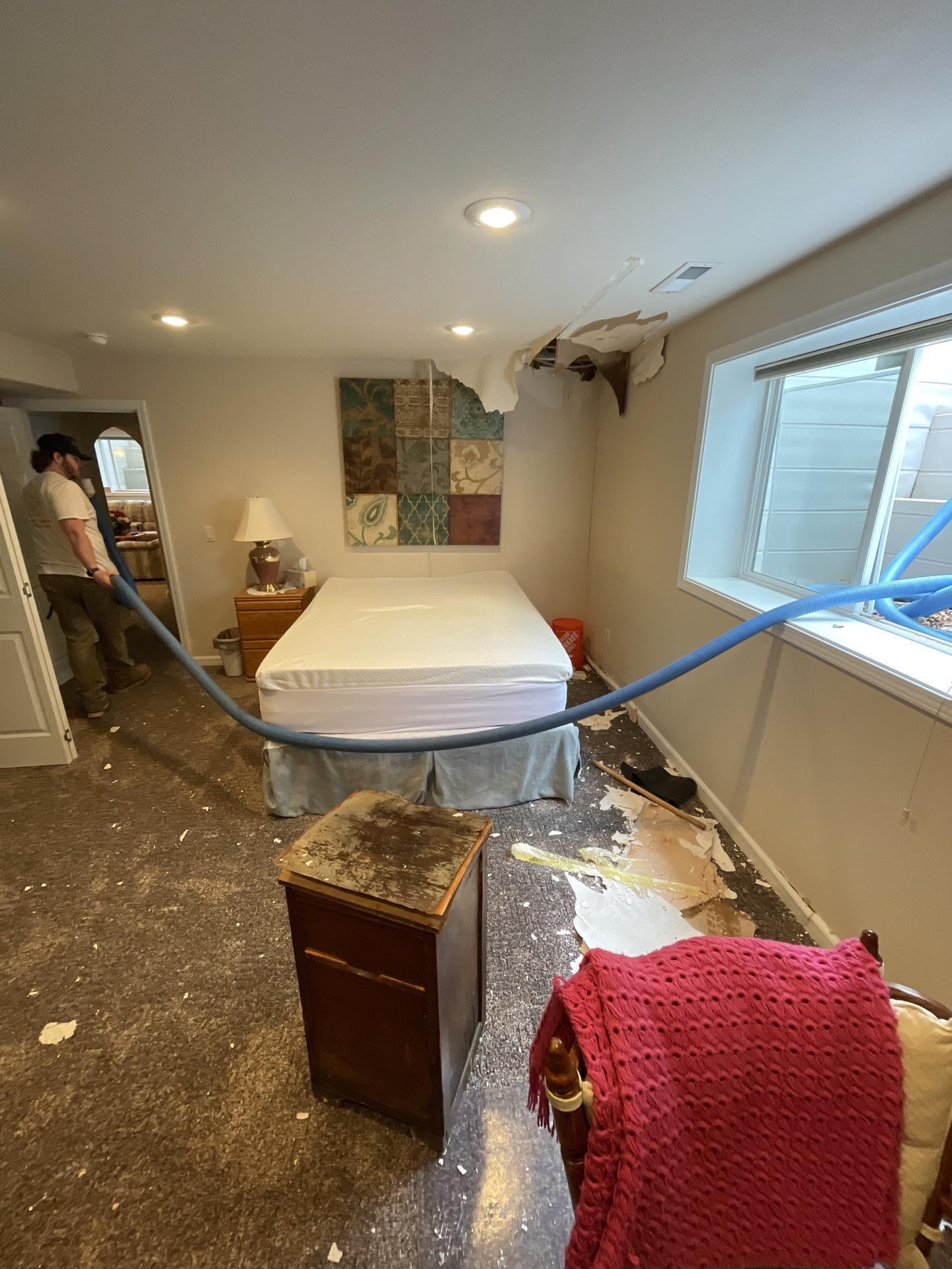 The customer experienced significant water damage and moisture intrusion in their bedroom, with bound moisture found between the vapor barrier and insulation. Materials showed signs of smell and microbial growth, requiring extensive restoration. Additional areas needing demolition include the kitchen tile floor, exterior basement wall/ceiling, and basement carpet.