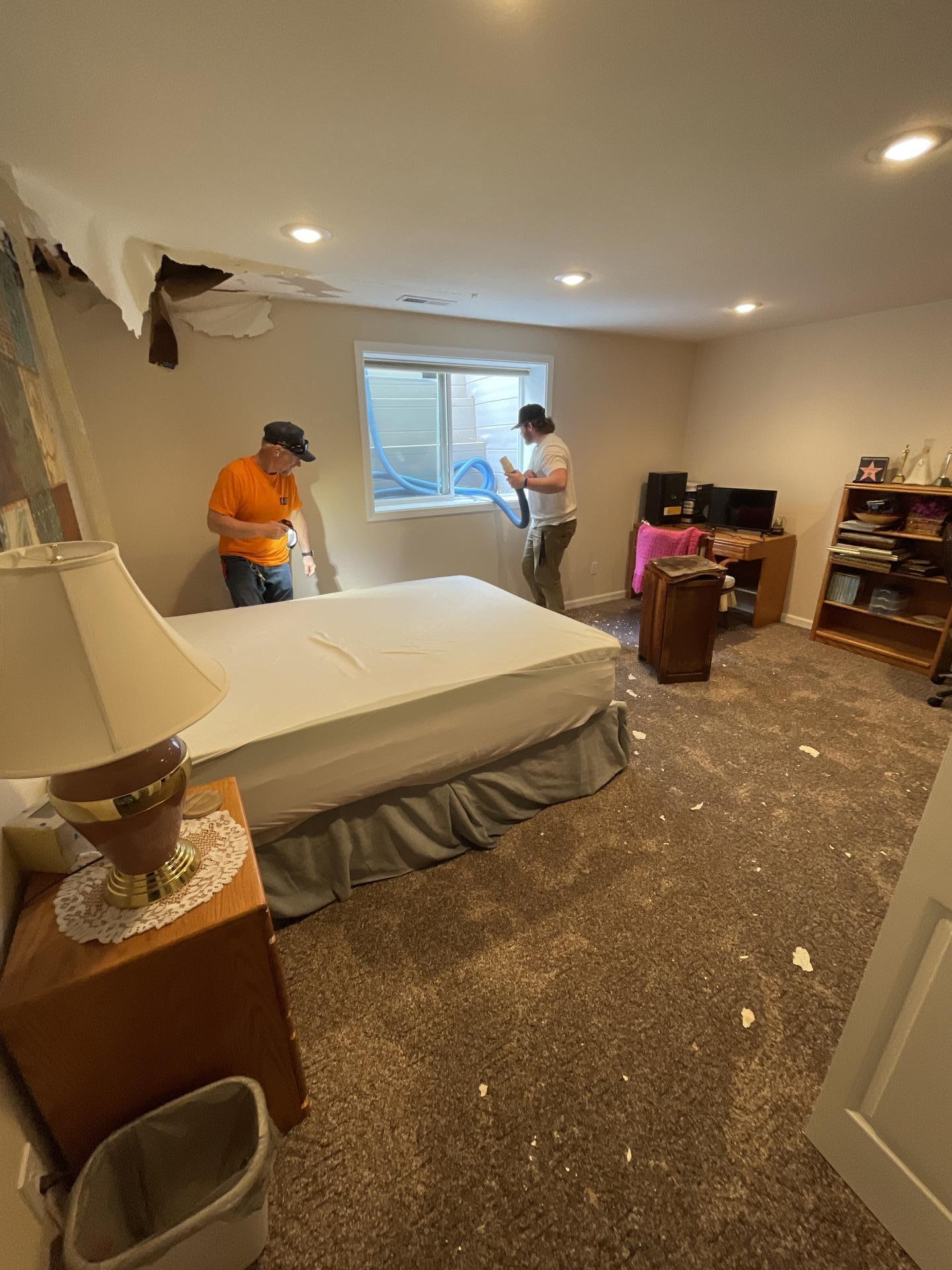 Alpha Omega Restoration Pros completed all initial demolition in the affected bedroom, removing damaged drywall and insulation. They performed an initial HEPA vacuuming, removed negative air pressure, and hauled out all debris. Future work includes sanding affected and stained framing, completing a final clean in the bedroom, and conducting further demolition of the kitchen tile floor, exterior basement wall/ceiling, and basement carpet due to microbial growth and odor concerns. The customer agreed to proceed with the additional scope of work.