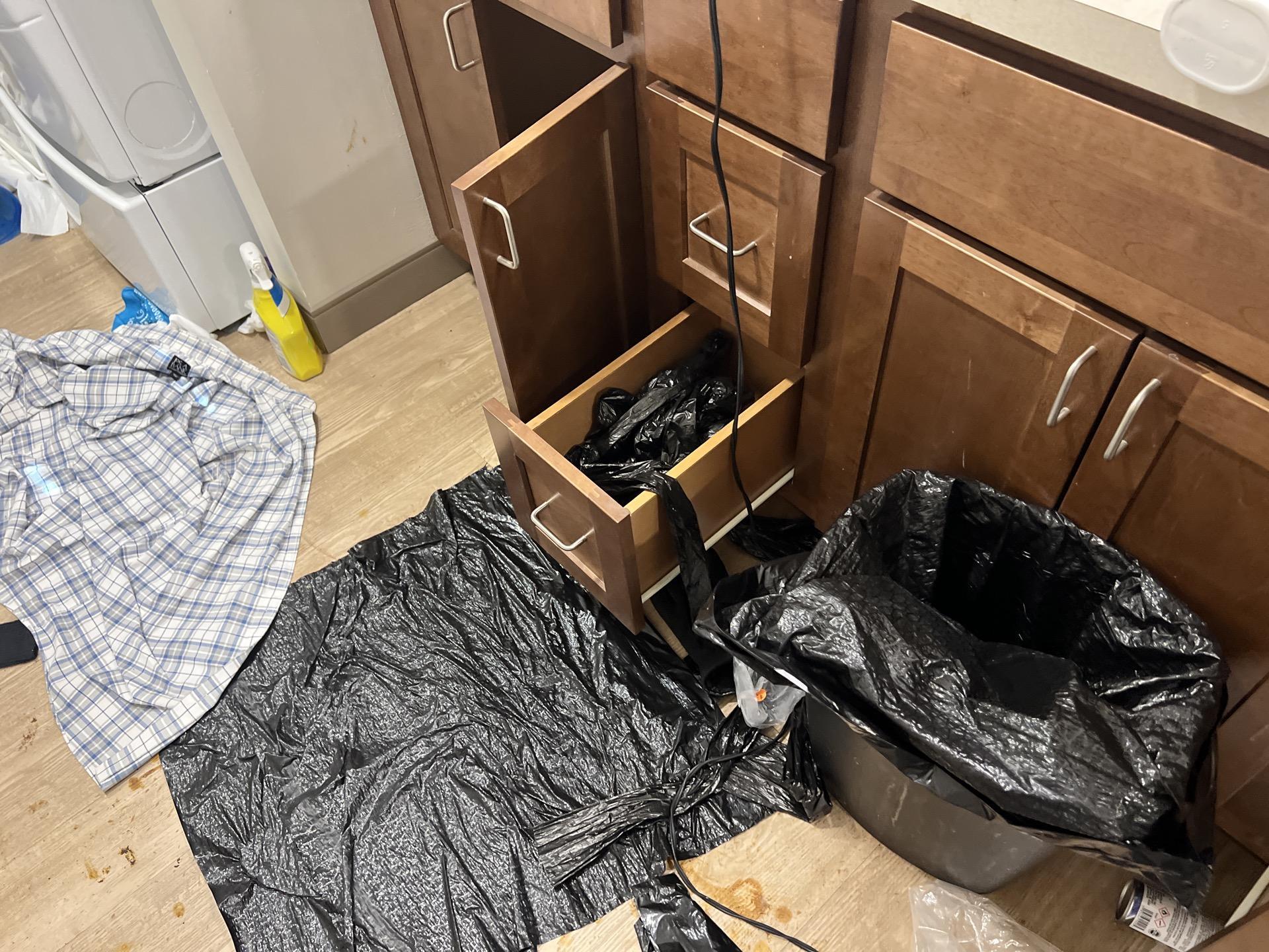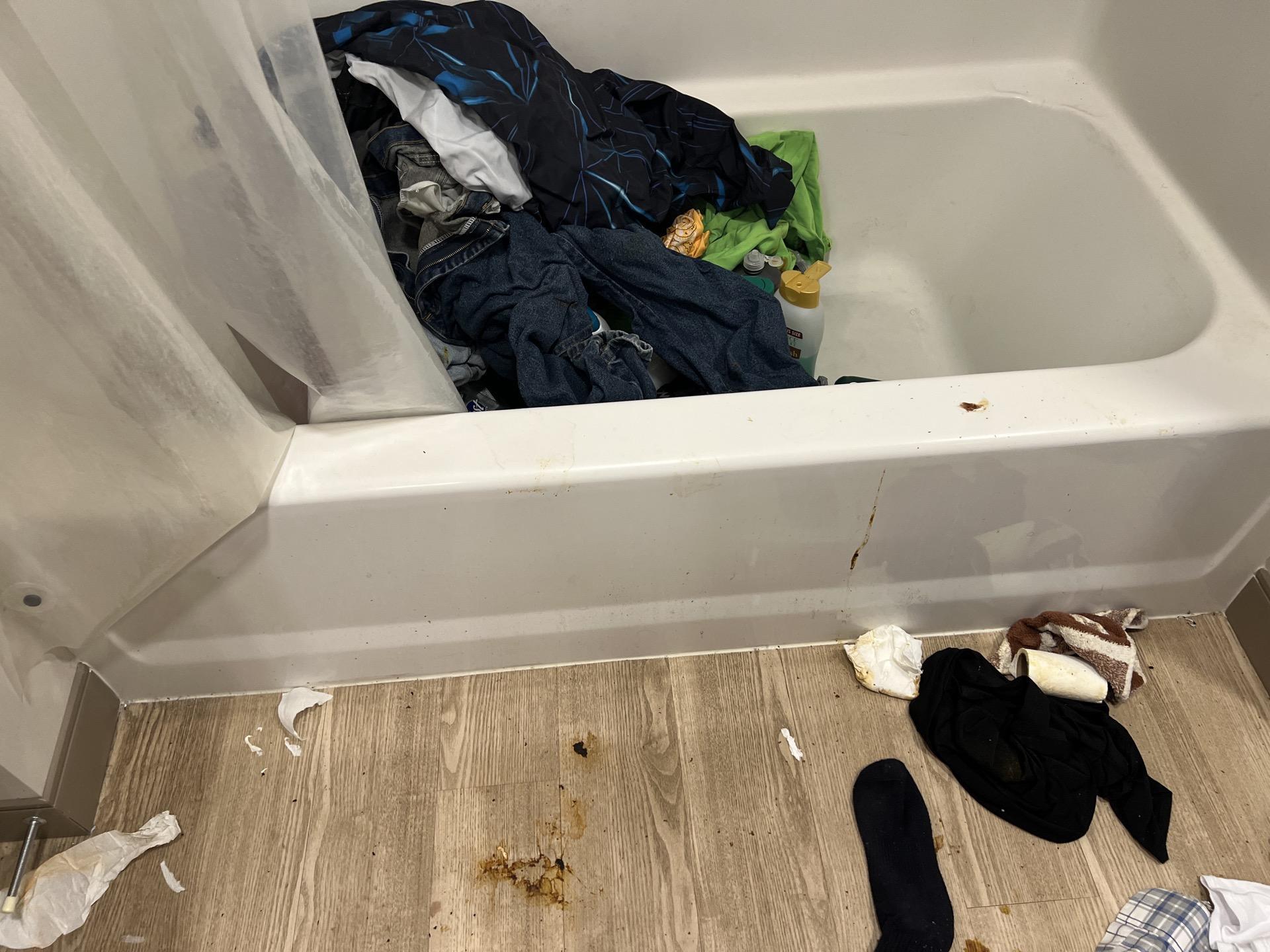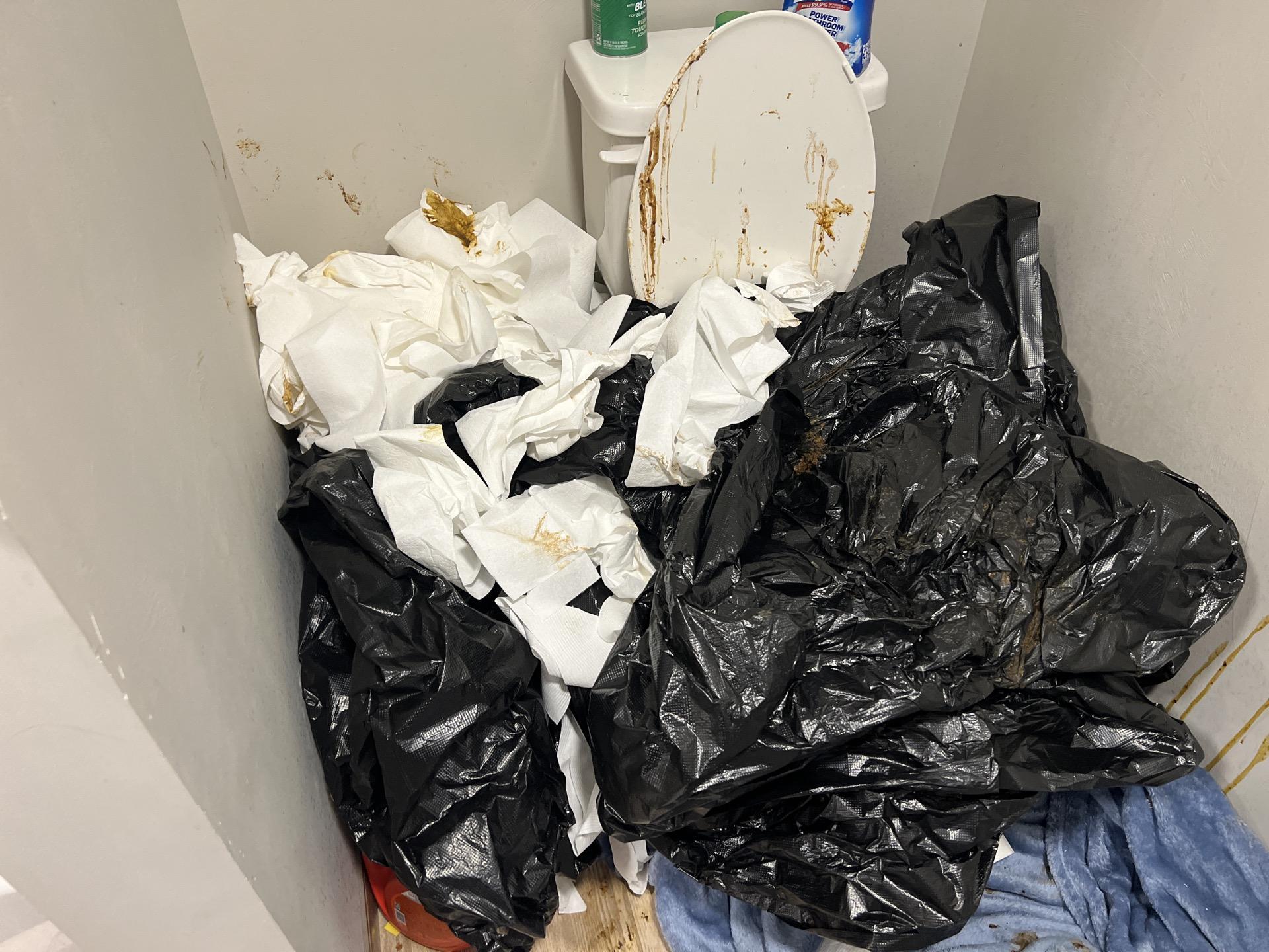 Our team conducted an initial inspection and began the process of safely bagging and removing all contaminated items from the bathroom. This included disposing of all soiled clothes, used toilet paper, and other hazardous waste into heavy-duty black bags. Following the initial pack-out, a thorough surface cleaning of all affected areas was performed. Recommendations for further demolition will be provided after the initial cleaning and decontamination are completed.