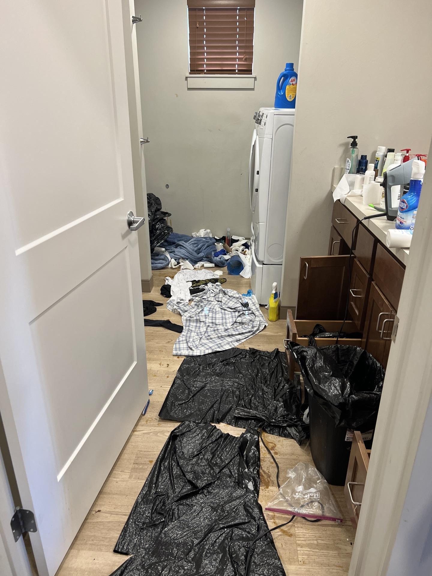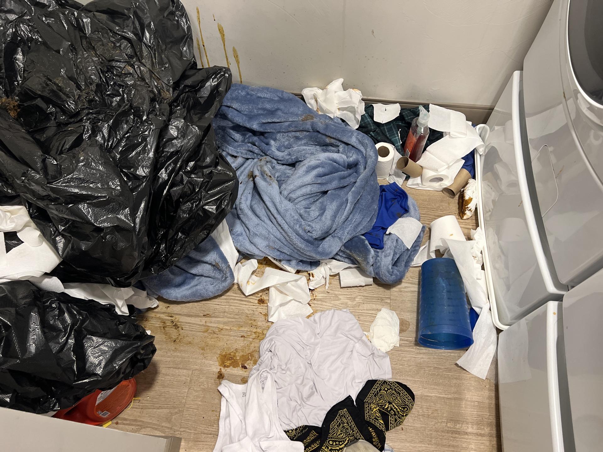 The customer's bathroom and adjacent laundry area were severely contaminated with feces, used toilet paper, and other hazardous materials, creating a biohazard situation requiring specialized cleanup.