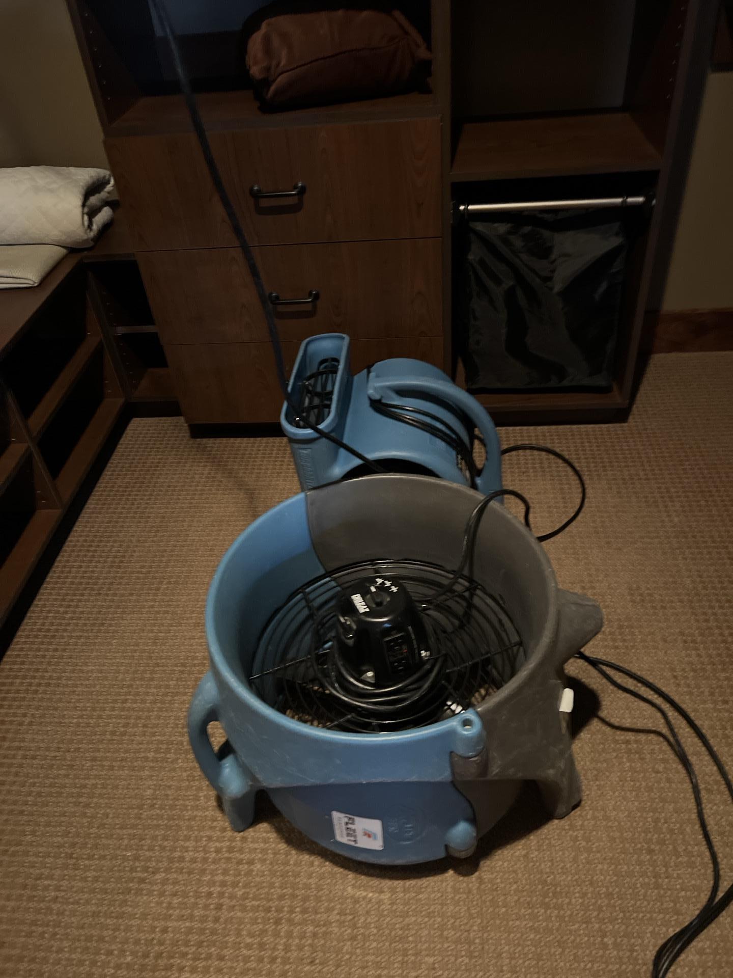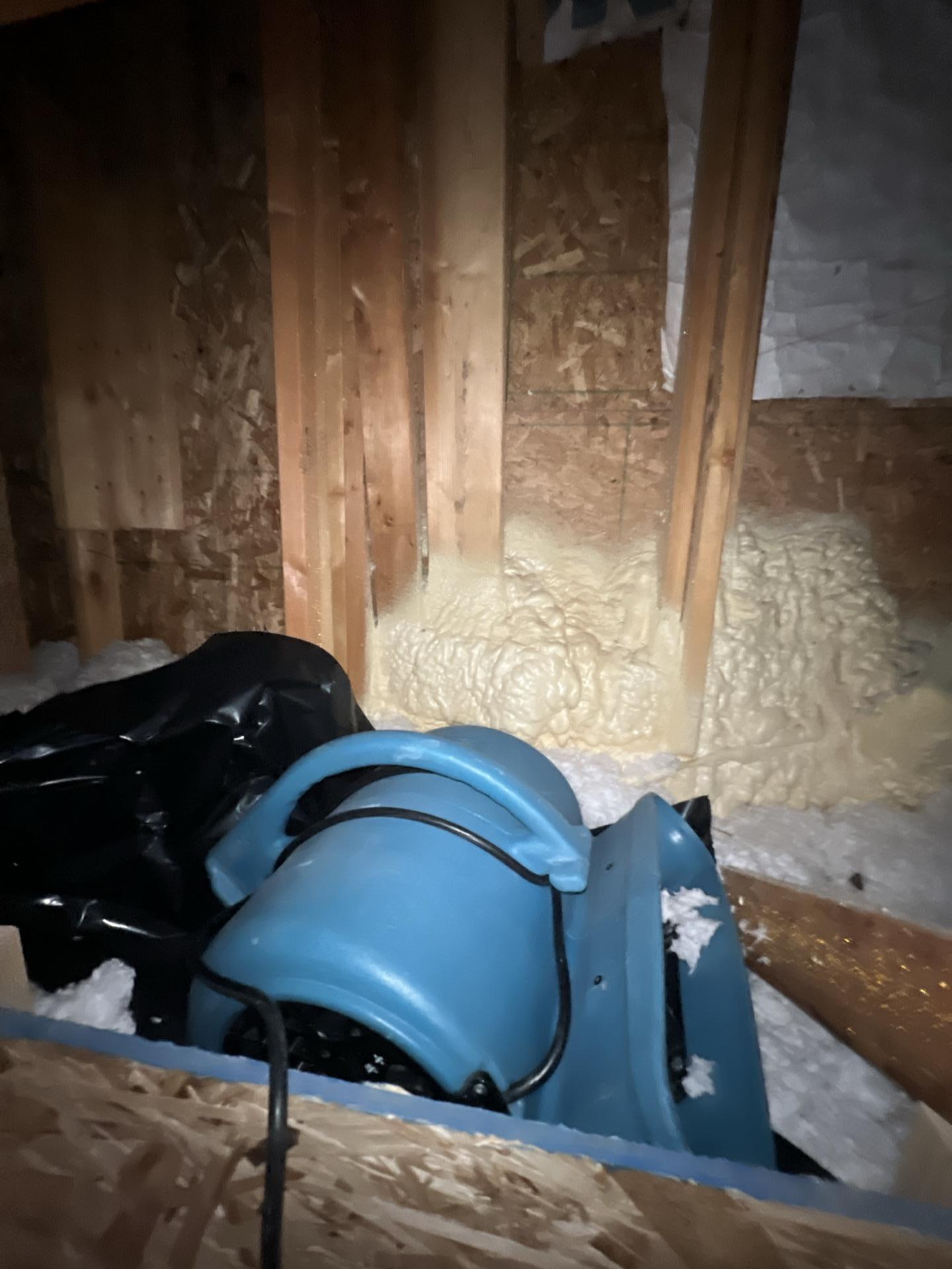 Technicians performed a thorough walkthrough and Water Services Agreement (WSA) to assess the damage. The team removed all saturated blown-in insulation from the attic to prevent further moisture migration. To stabilize the environment, industrial drying equipment was deployed to target the attic framing and sheathing, the closet's drywall ceiling, and the carpet. The team also provided a clear communication plan, updating the client on the mitigation progress and scheduling a return visit for monitoring and equipment removal.