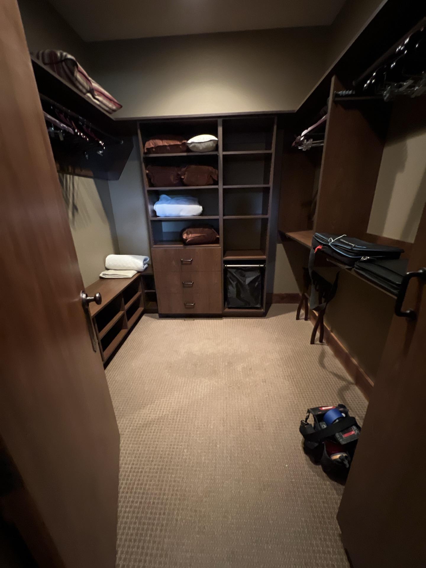 The customer experienced a roof leak that resulted in water damage to the closet, specifically affecting the drywall ceiling, the carpeted flooring, and the insulation in the attic space above.