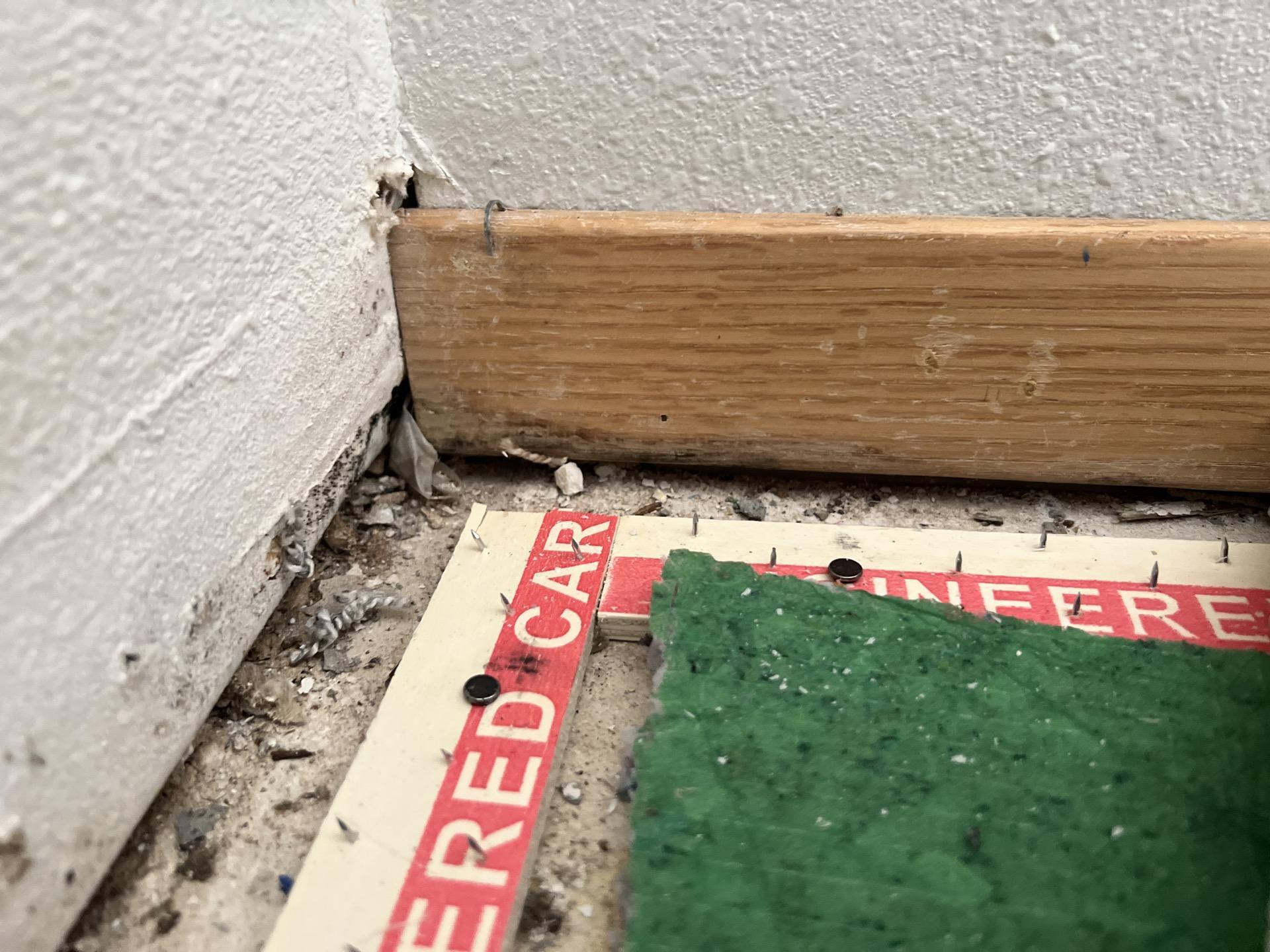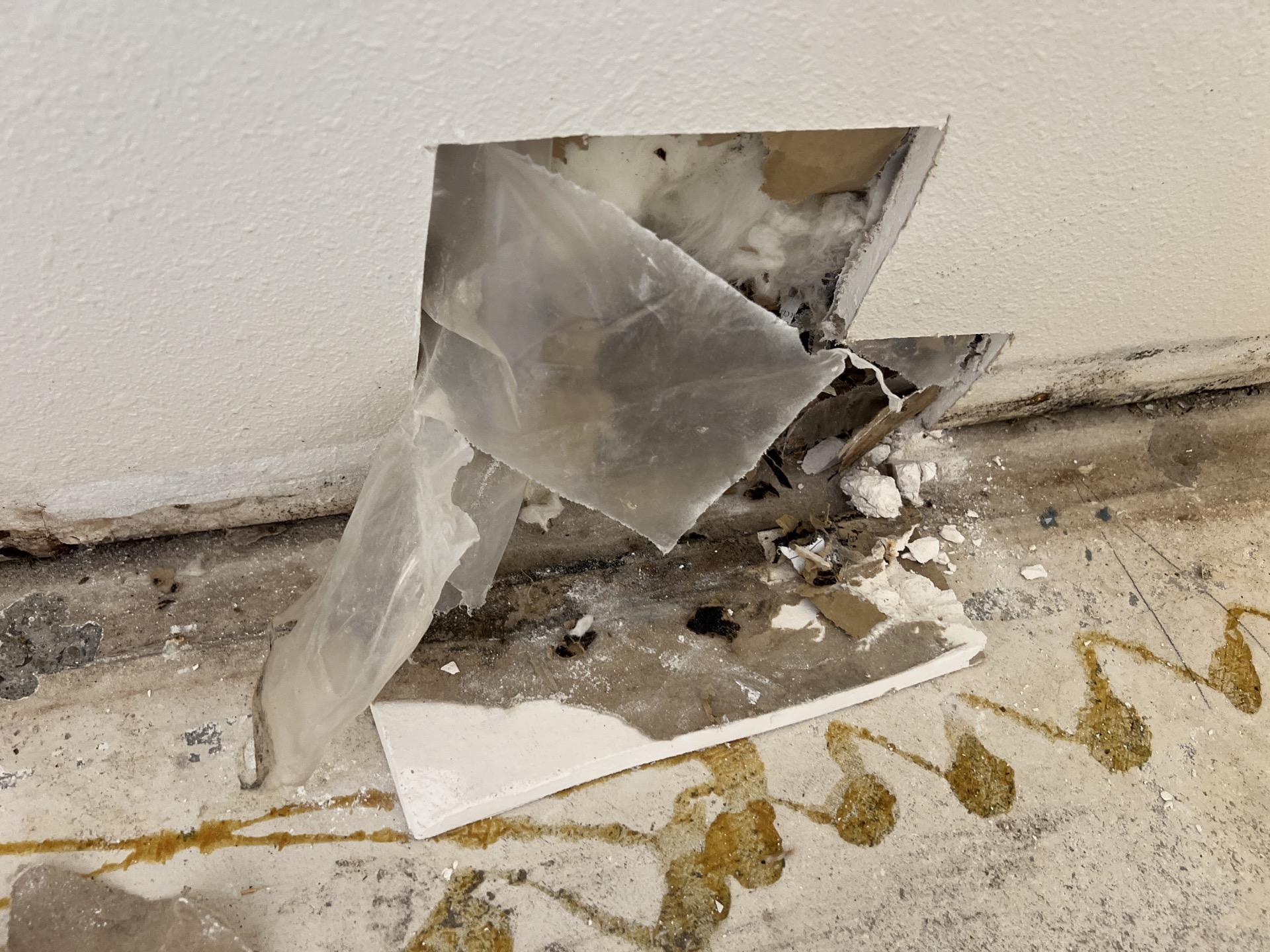 The customer required professional remediation for water damage that had penetrated the wall assembly, affecting the baseboards, drywall, and internal insulation. The intrusion necessitated specialized removal of contaminated materials to prevent mold growth and structural compromise.